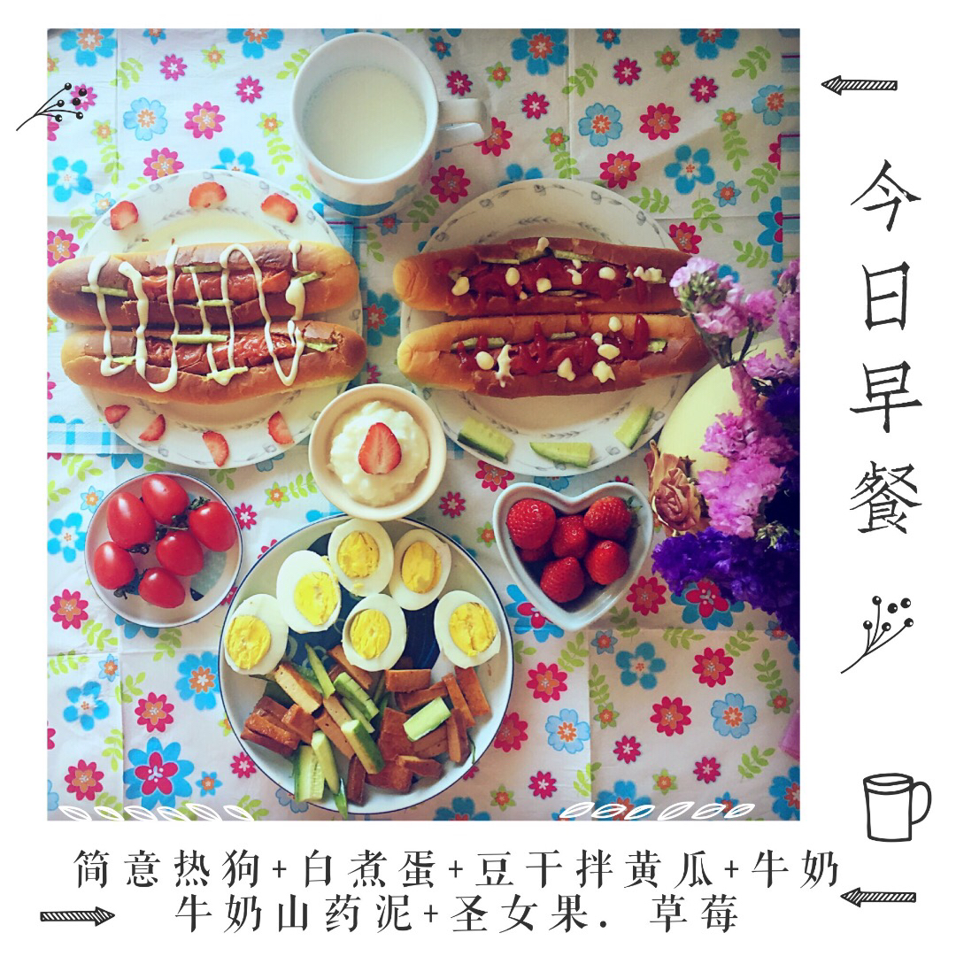 今日早餐,简意热狗+白煮蛋+豆干拌黄瓜+牛奶+牛奶山药泥+圣女果.草莓。女儿不用上学,一家三口轻轻松松的吃着早餐,没有忙...