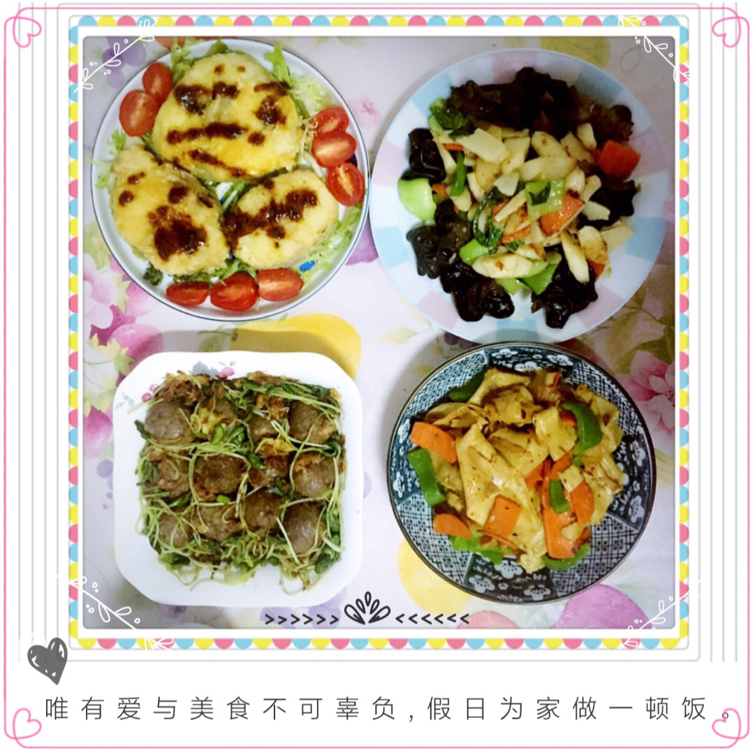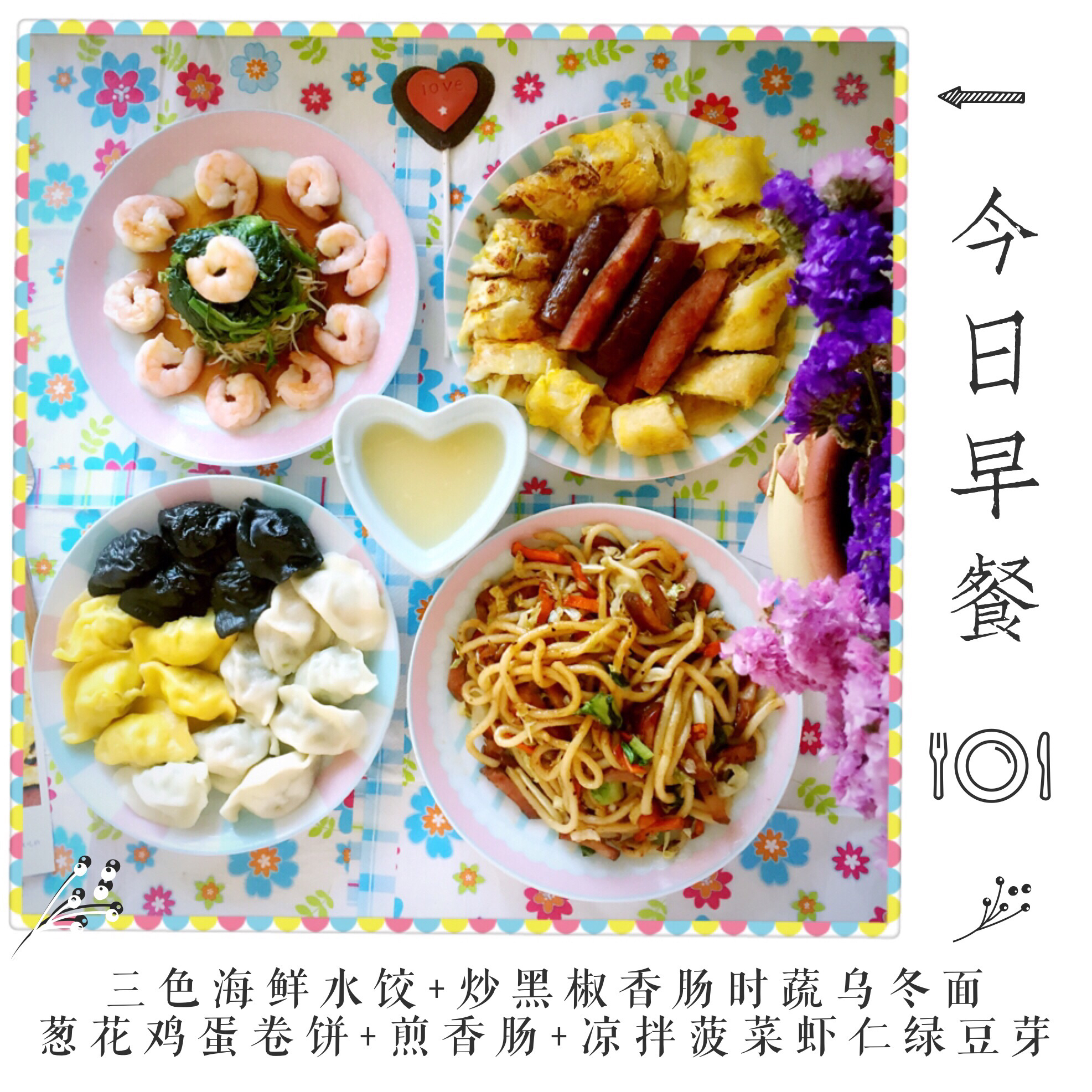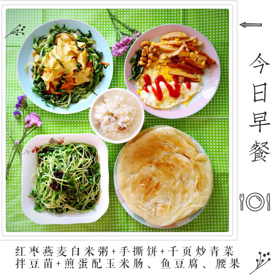 葱花鸡蛋卷饼+煎香肠+凉拌菠菜虾仁绿豆芽。爱生活有各种表现方式,做饭和拍照...