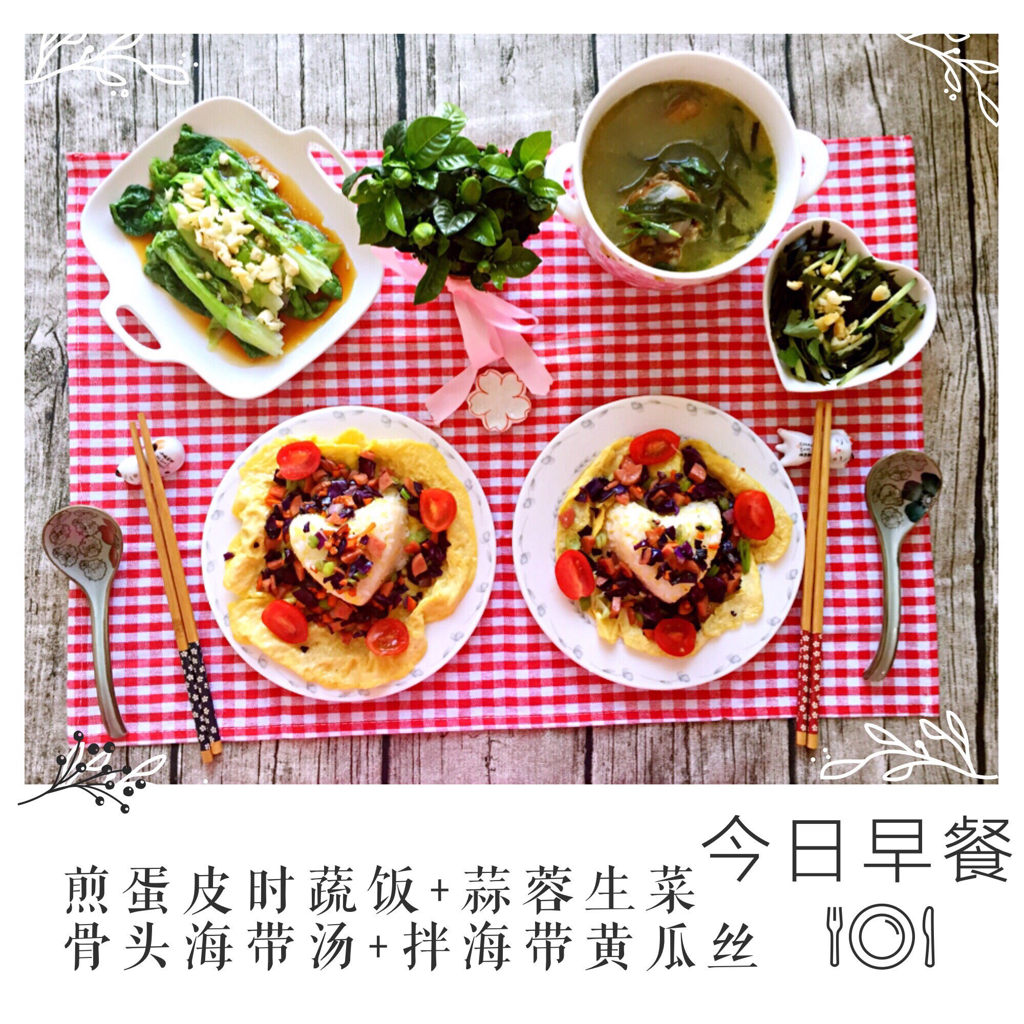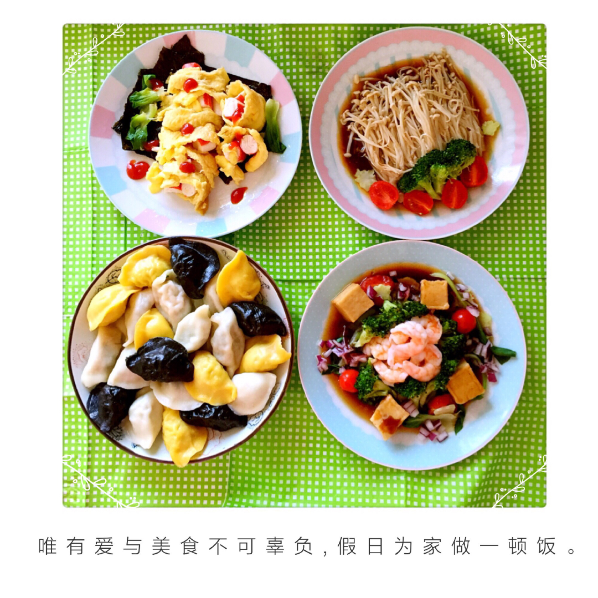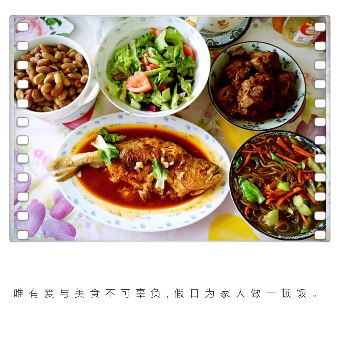 葱花鸡蛋卷饼+煎香肠+凉拌菠菜虾仁绿豆芽。爱生活有各种表现方式,做饭和拍照...