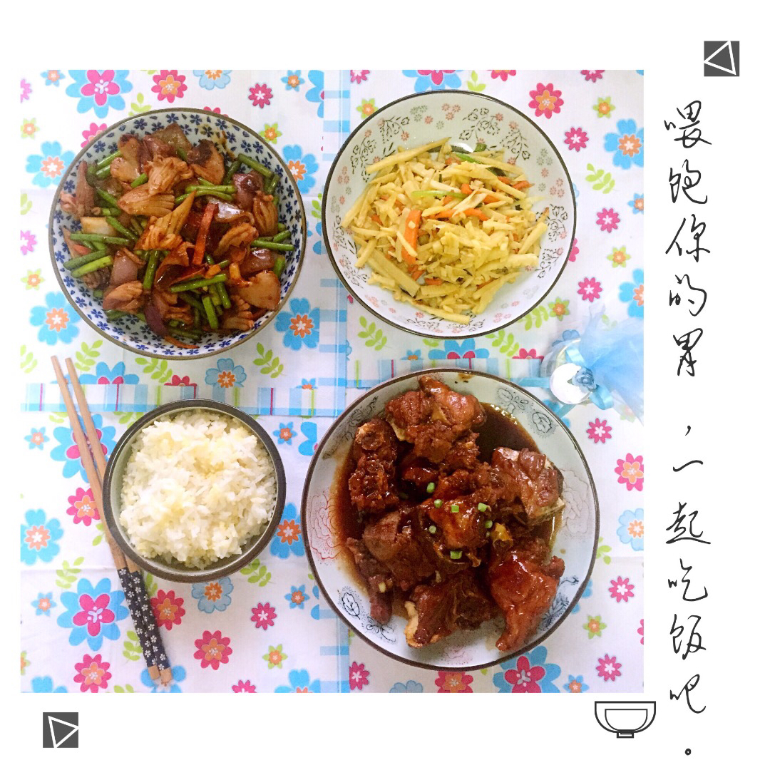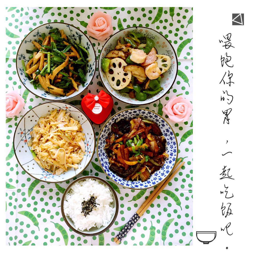 今日晚餐,今日晩餐,韭菜炒千页豆腐+藕片香菇虾仁青椒小炒+蕃茄汁炒大头菜丝+照烧汁茄子土豆条。 #晚餐•2016年4月1...