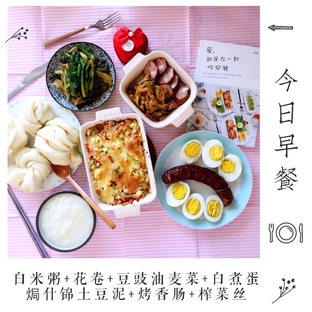 焗什锦土豆泥+烤香肠+榨菜丝。一家三口的早餐,中西合璧,喜欢什么吃什么。 #...