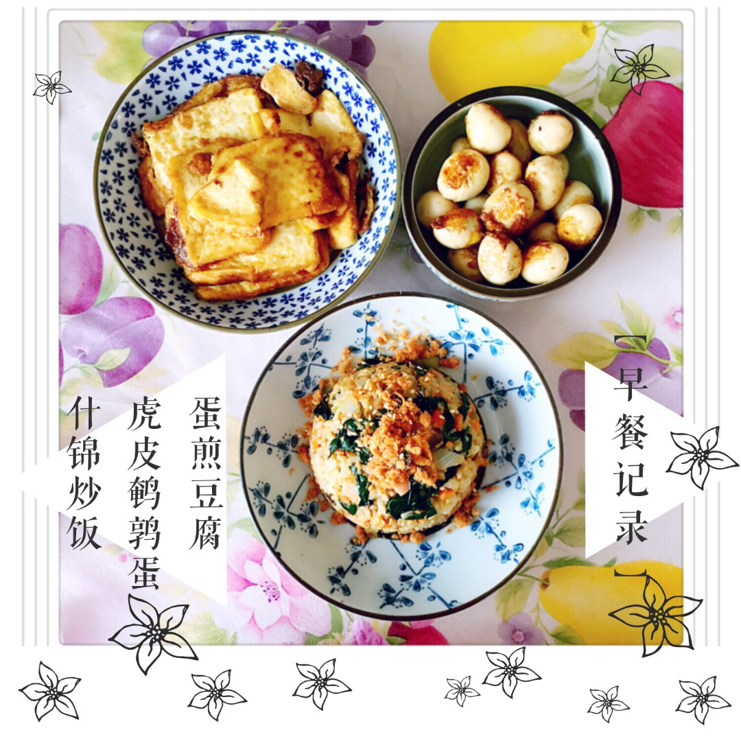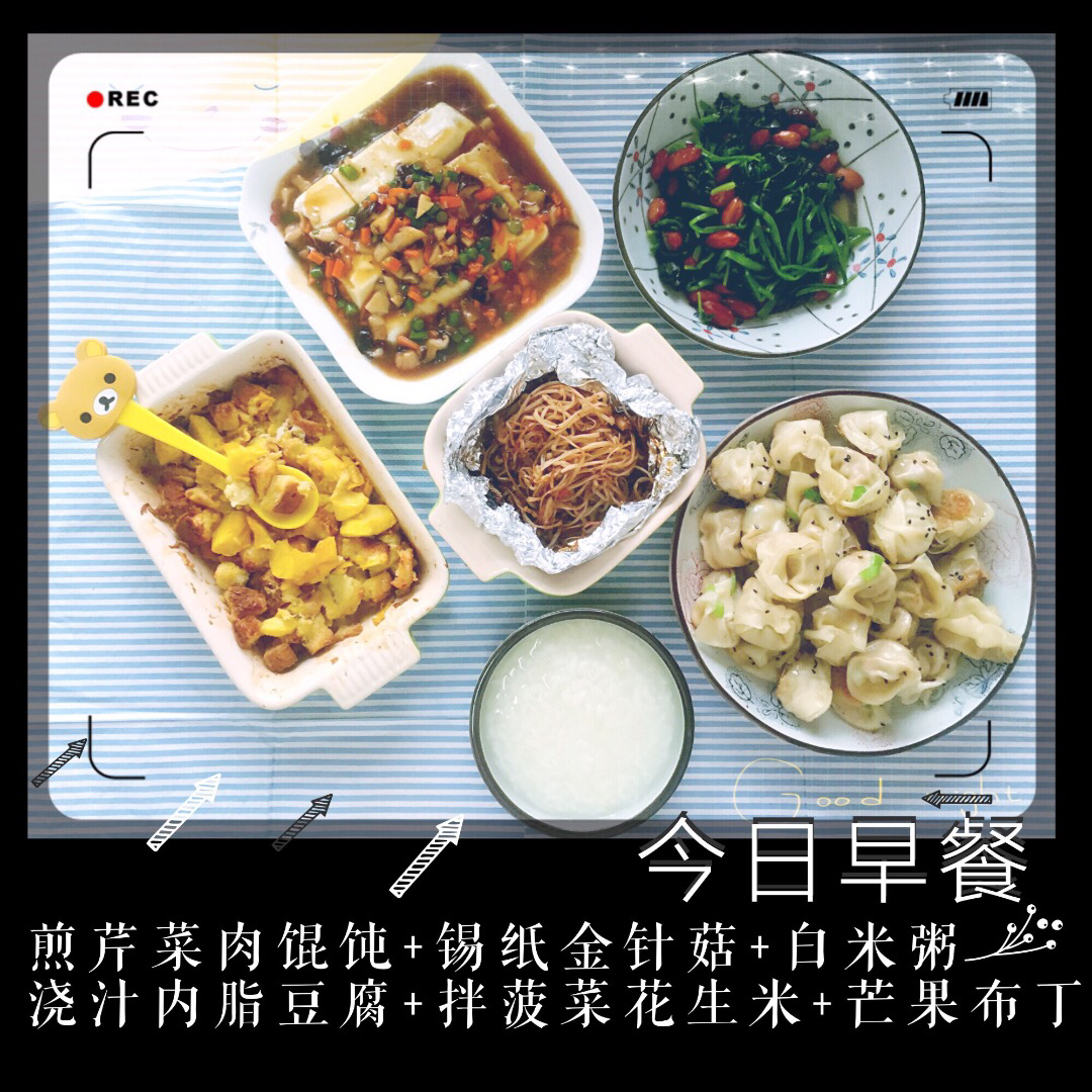 今日早餐,煎芹菜肉馄饨+锡纸金针菇+浇汁内脂豆腐+拌菠菜花生米+芒果布丁+白米粥。今天又是下雨天,真适合睡觉。这顿算早午...