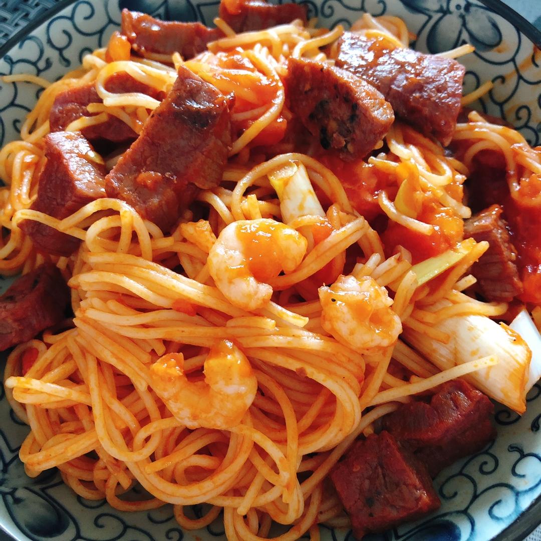 哄娃间隙做了份小杂烩意面🍝
