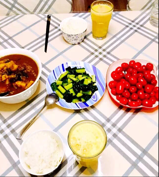 土豆茄子酱➕素炝黄瓜➕小番茄➕白米饭➕西柚苹果雪梨柠檬汁
