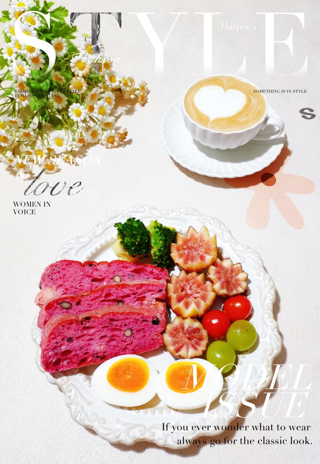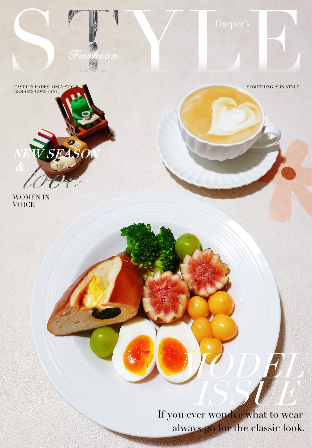 爆浆芝士墨鱼肠碱水面包 水煮蛋 西兰花🥦 无花果 葡萄 姑娘果 拿铁...