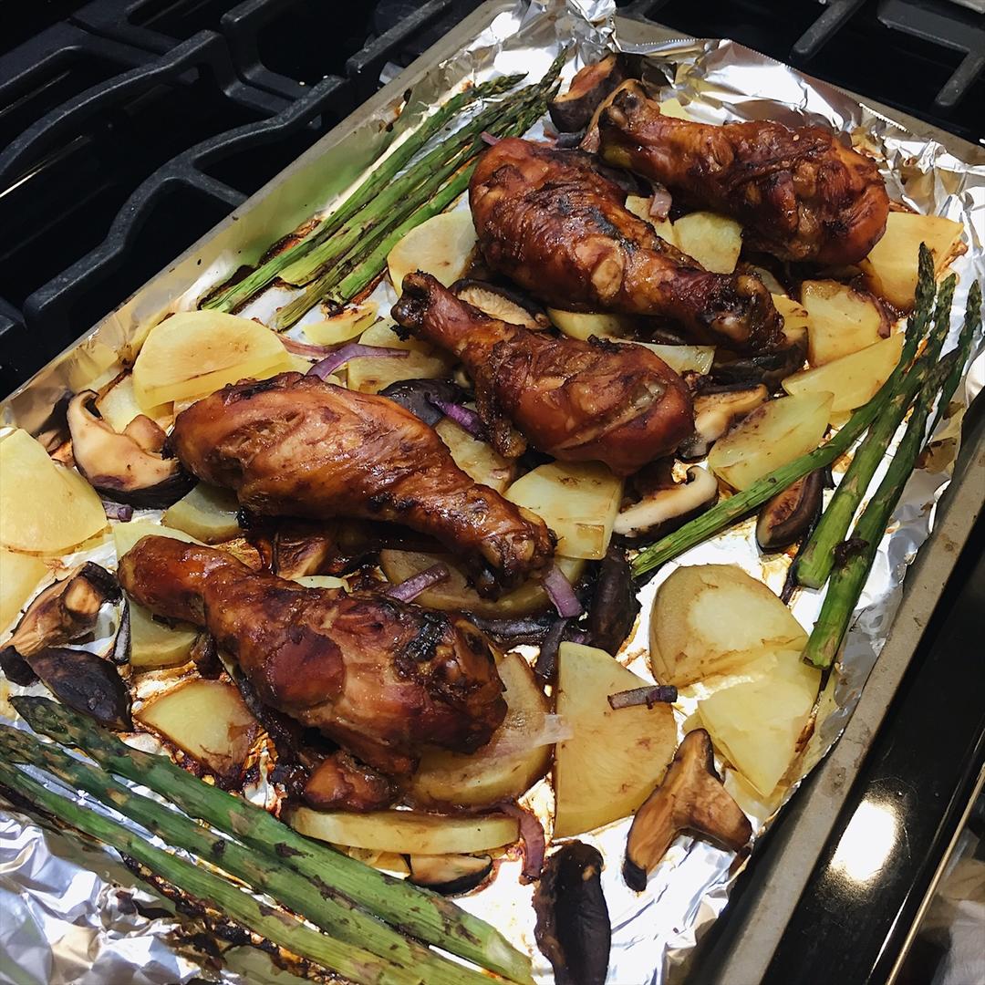 上午出门前腌上🍗,晚上进门预热烤箱准备蔬菜,烤。腌料比较随意,底下铺了土豆,洋葱,香菇、芦笋。