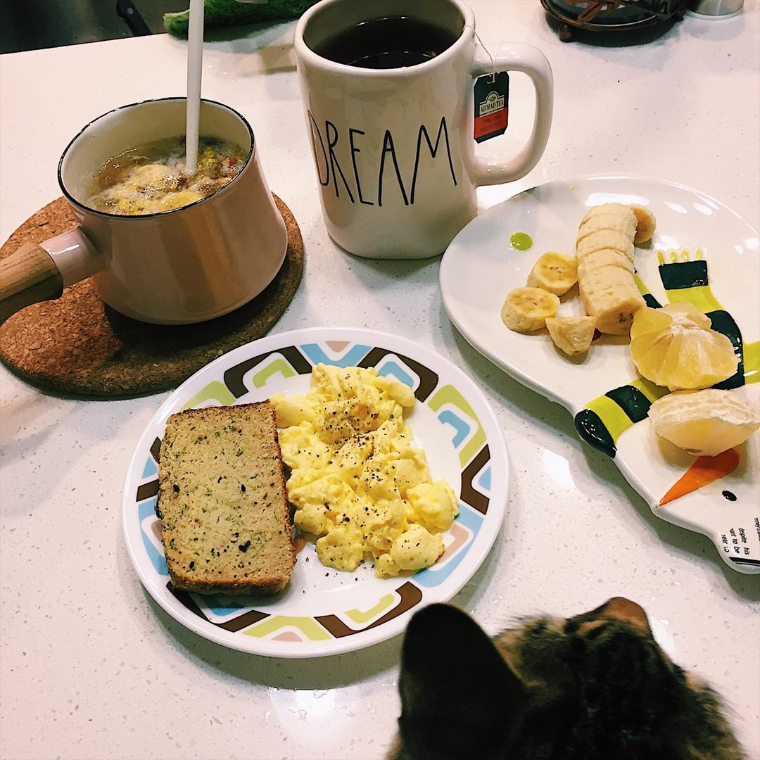 西葫芦奶酪面包,椰子油炒蛋白液,英式早餐红茶,甜柠檬,拇指蕉,桃胶皂角米等等等等羹。