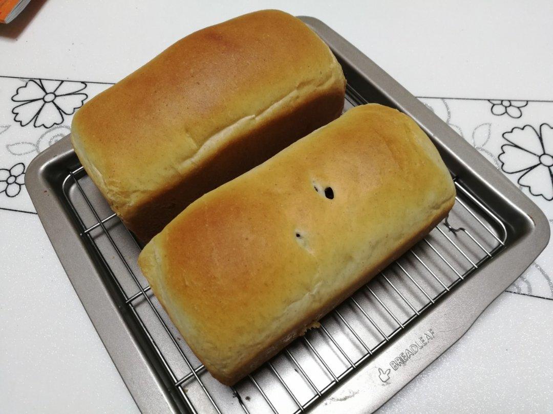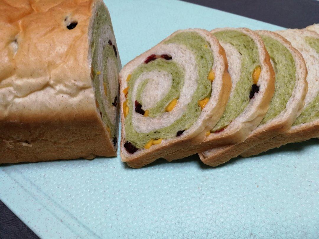 彩家的350克吐司模做了两个,放了芒果干和蔓越莓。第一次尝试做双色吐司,抹茶粉还有点没揉匀。#早餐•2019年1月14日...