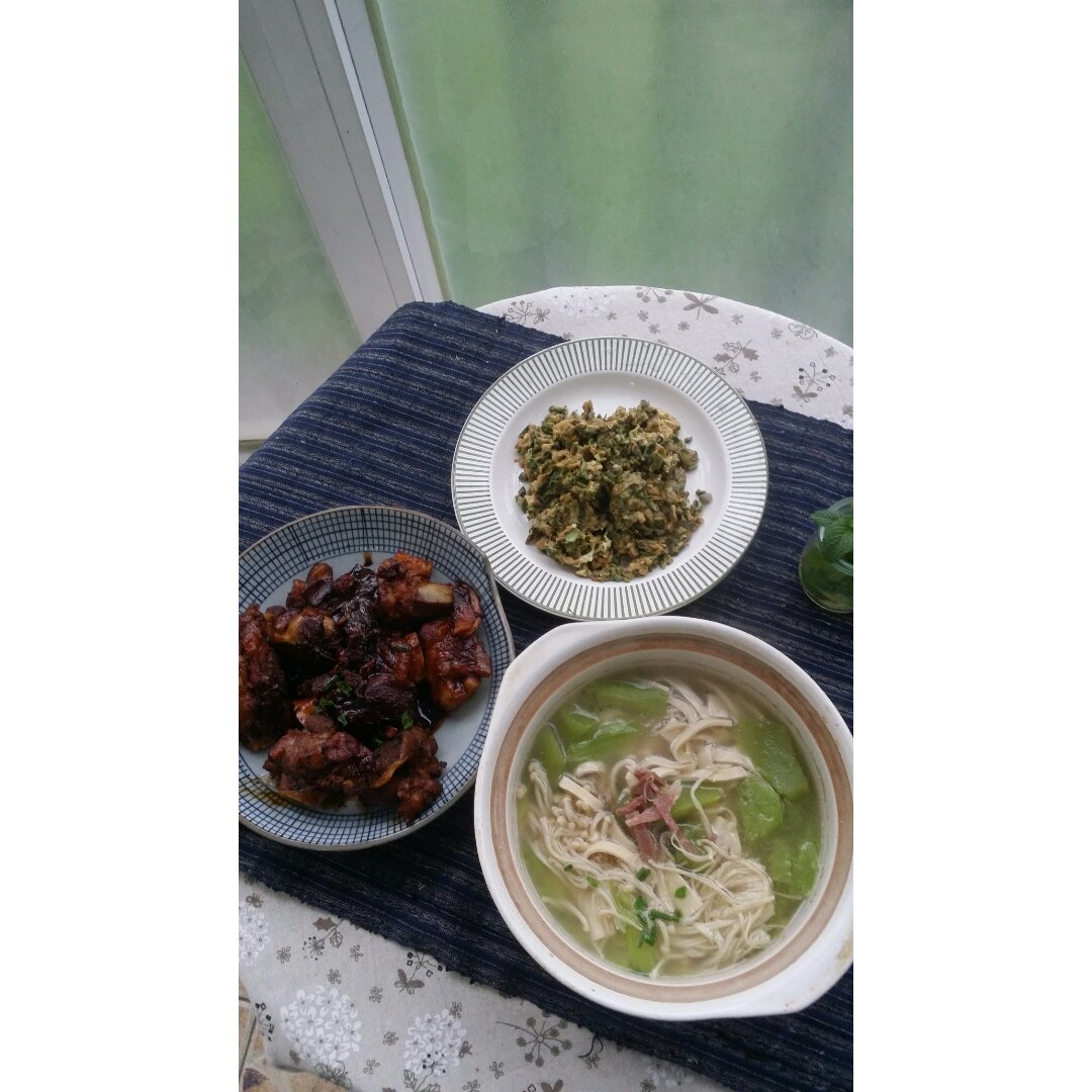 酱骨头,香椿炒蛋,莴笋百叶汤。