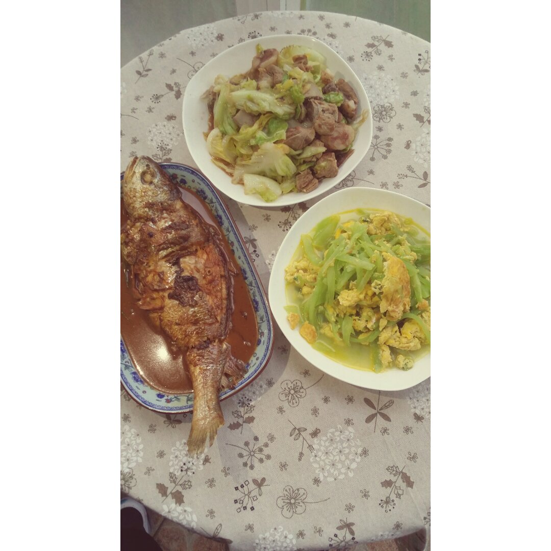 糖醋大黄鱼,莴笋炒蛋,炒卷心菜。