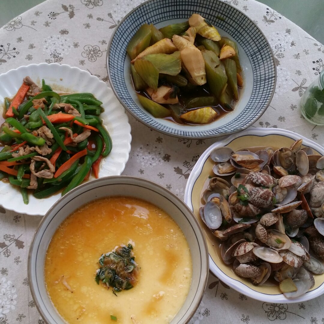 四点半下班,五点到家,自己给莴笋削皮,半小时搞定晚饭,虾皮炖蛋,青椒肉丝,炒花蛤,油焖双笋...