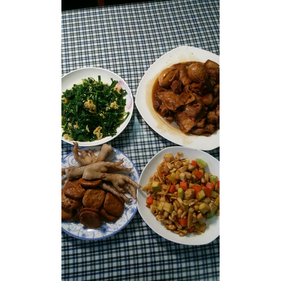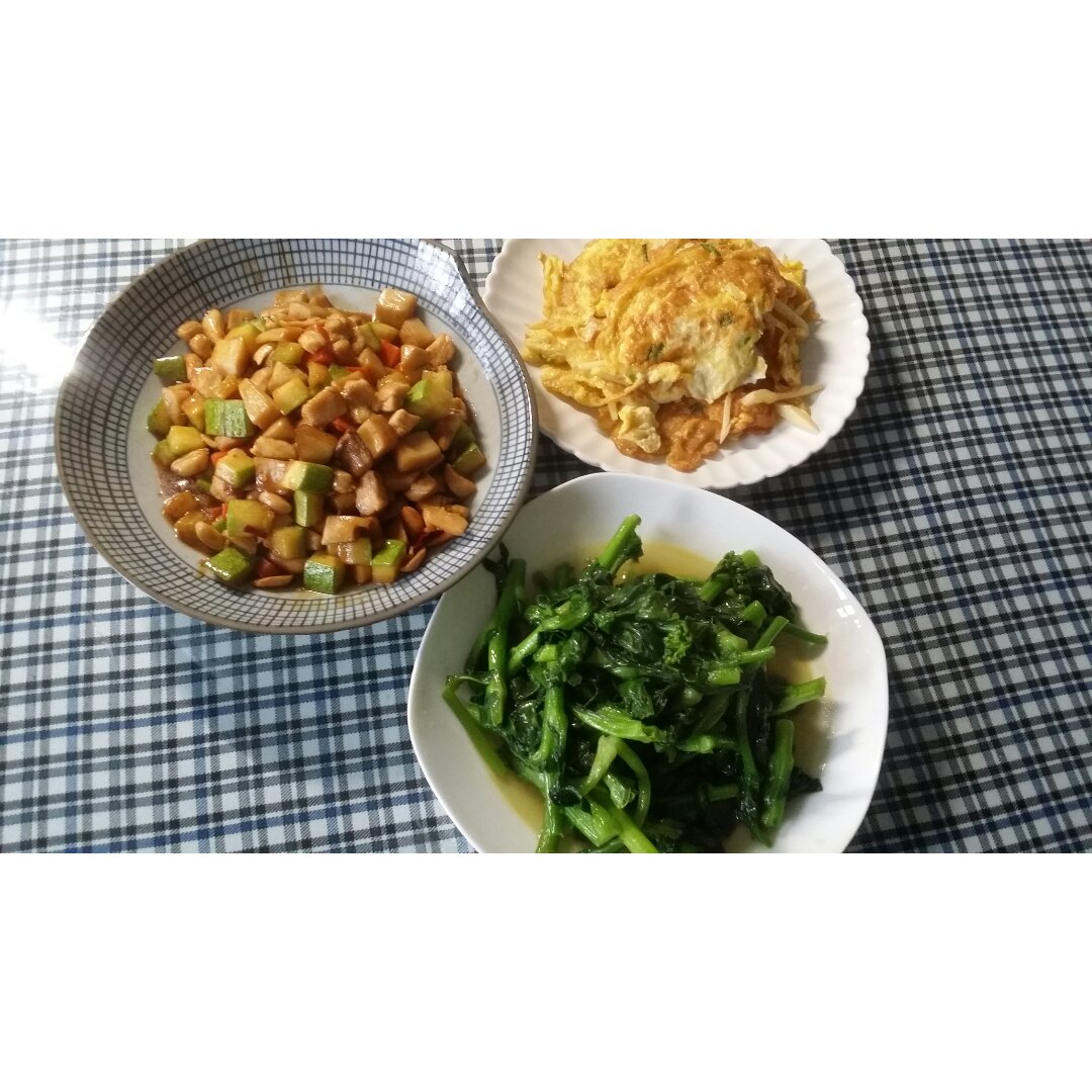 菜苔,笋丝摊蛋,随意版宫保鸡丁。