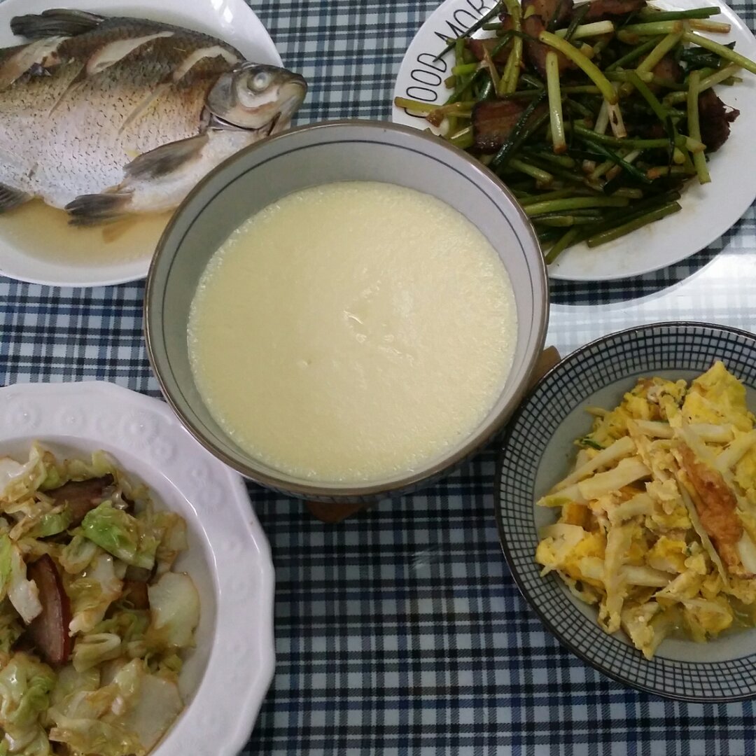 清蒸鳊鱼,蒜苗腊肉,干煸包菜,笋丝摊蛋,炖蛋。