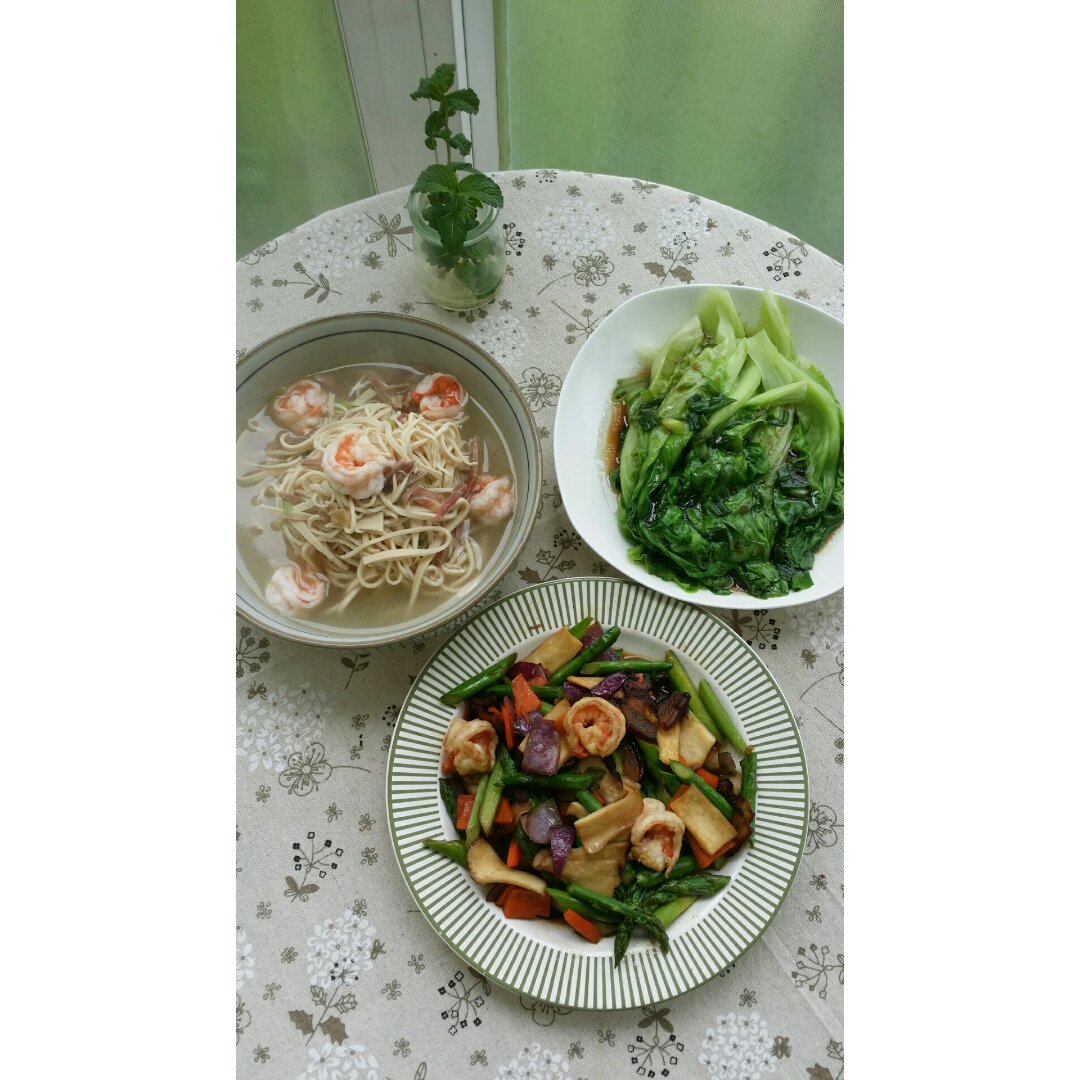 大煮干丝,芦笋杏鲍菇腊肉胡萝卜洋葱杂炒,生菜,牛尾汤。天时阴时雨,风时大...