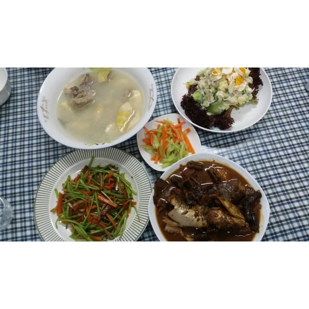 笋炖肉,芦蒿香干,鱼,日式土豆沙拉,一小碟凉拌莴笋丝,因为大半盘被我洒了。...