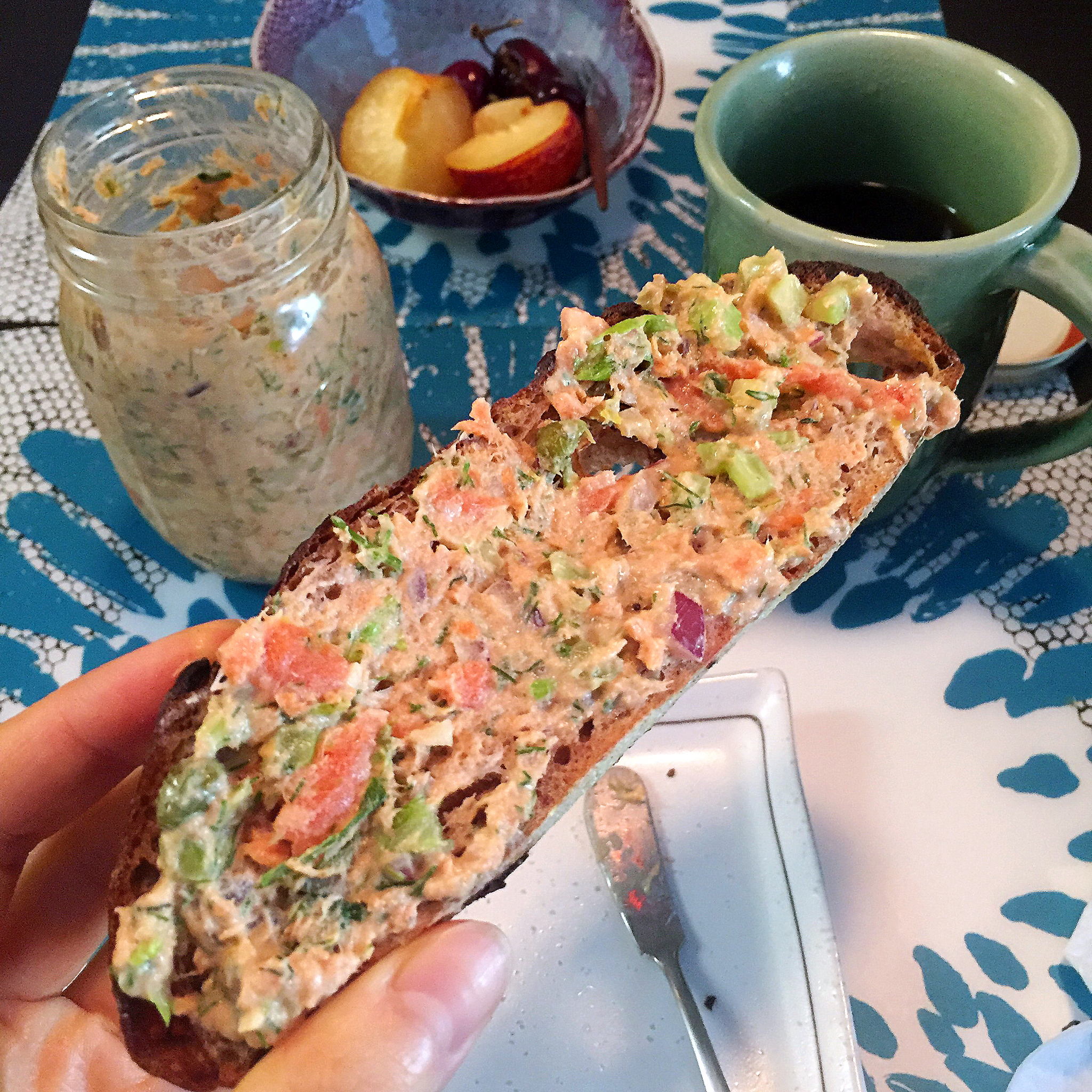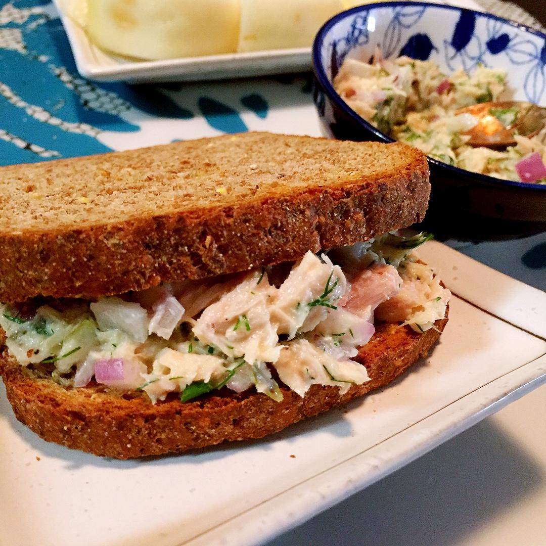 还是一个人吃早餐。金枪鱼沙拉配发芽谷物面包吃一辈子也不腻。鱼罐头扔给俩猫主子舔了。主子们一大早就有加餐表示很满意。 #早...