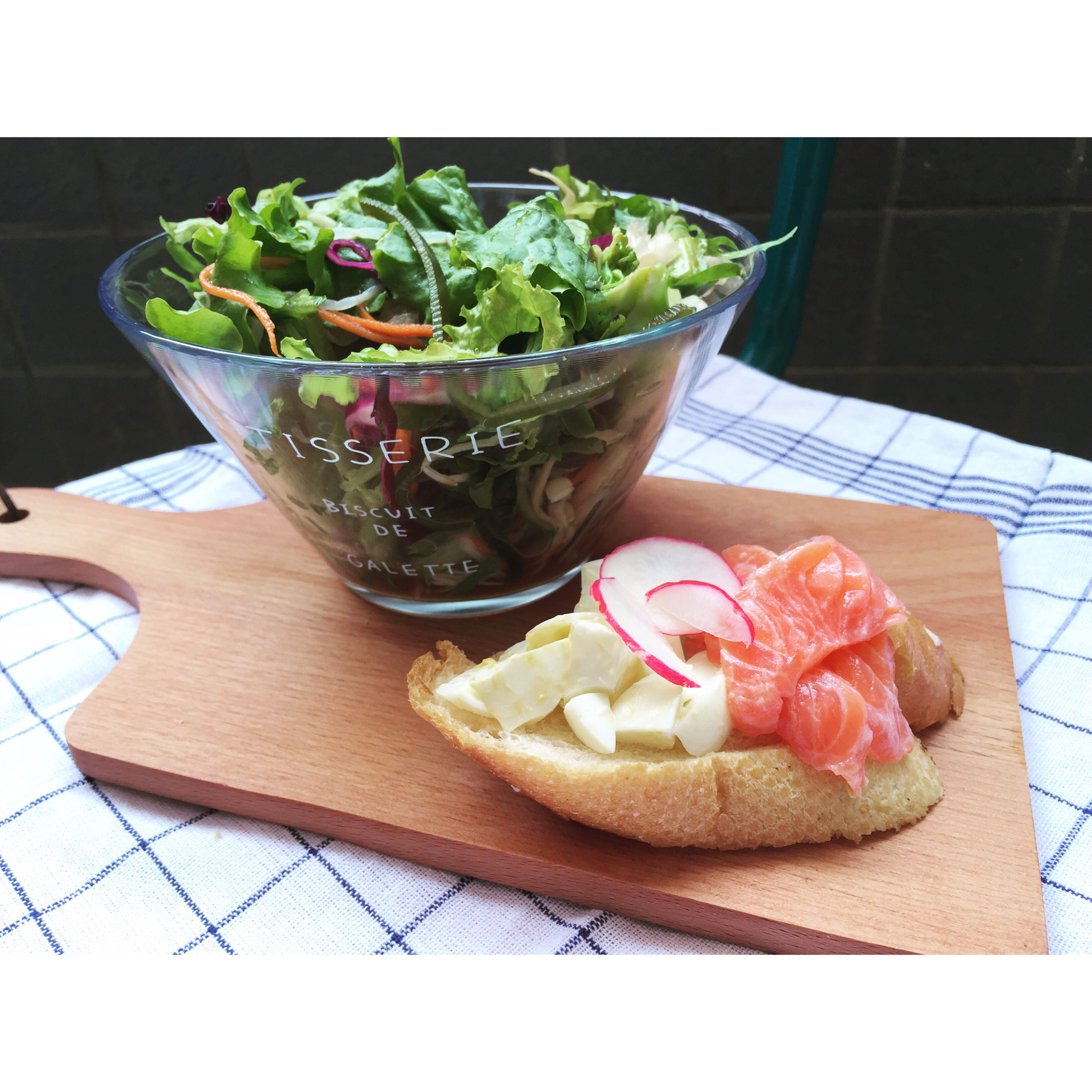 自己搞了个伪BS的tartine 三文鱼配蛋黄酱鸡蛋沙拉佐水萝卜