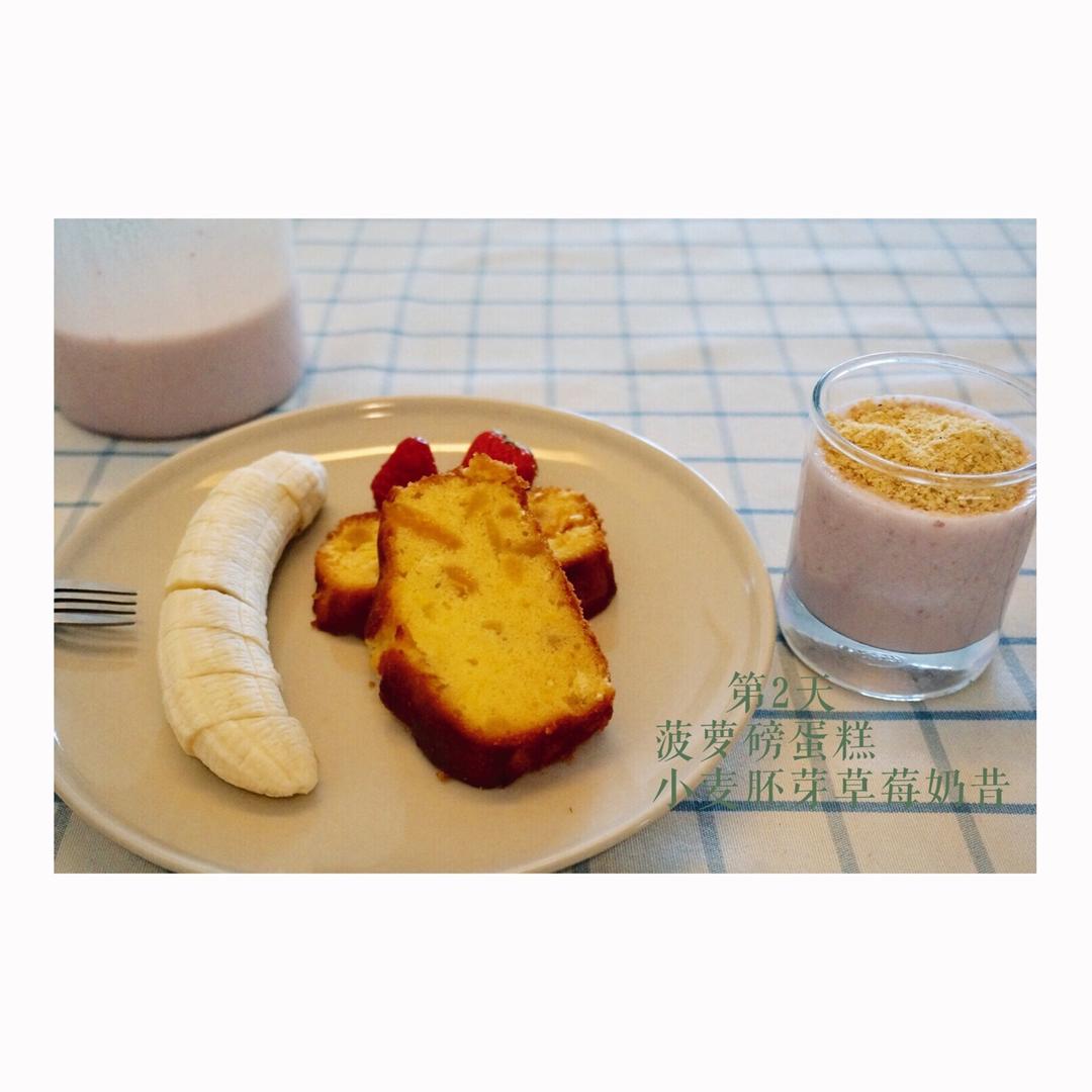 早餐:菠萝磅蛋糕、小麦胚芽草莓奶昔、香蕉。磅蛋糕冷藏一晚便忍不住切开了,很香,没吃完的菠萝随意熬制后的软硬甜度...