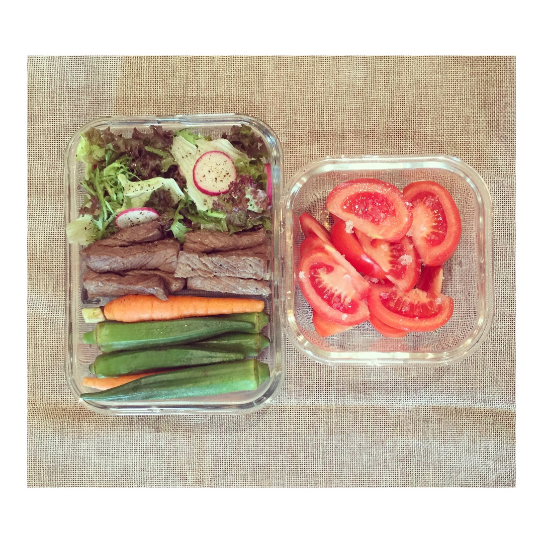 午餐:蔬菜沙拉,煎牛肉,水煮秋葵、胡萝卜,西红柿