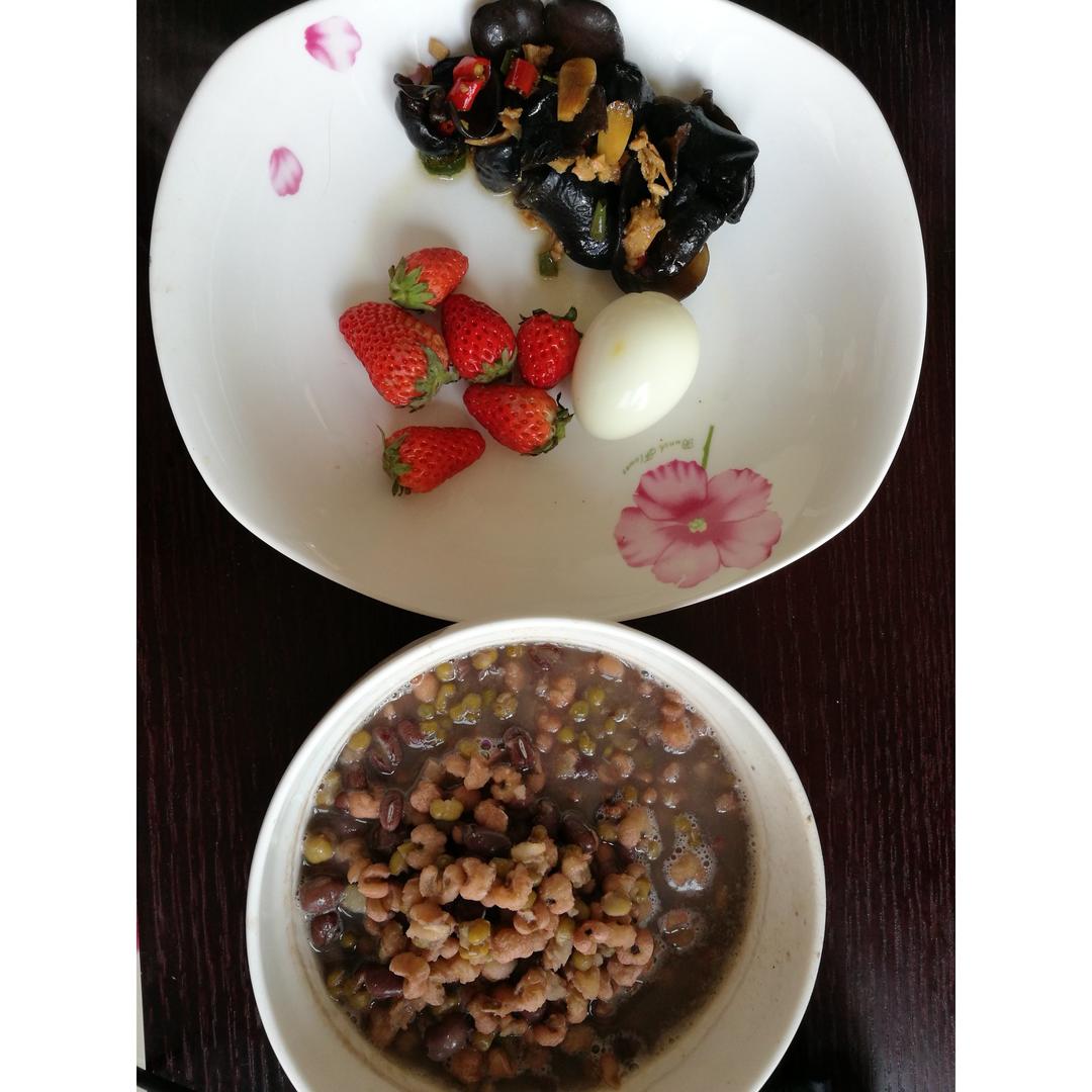 排湿粥+鸡蛋+木耳小菜。早晨一起床满屋都是豆香,木耳是前一天晚上的晚餐,鸡蛋嘛入冷水煮12分钟取出,一定是熟得...