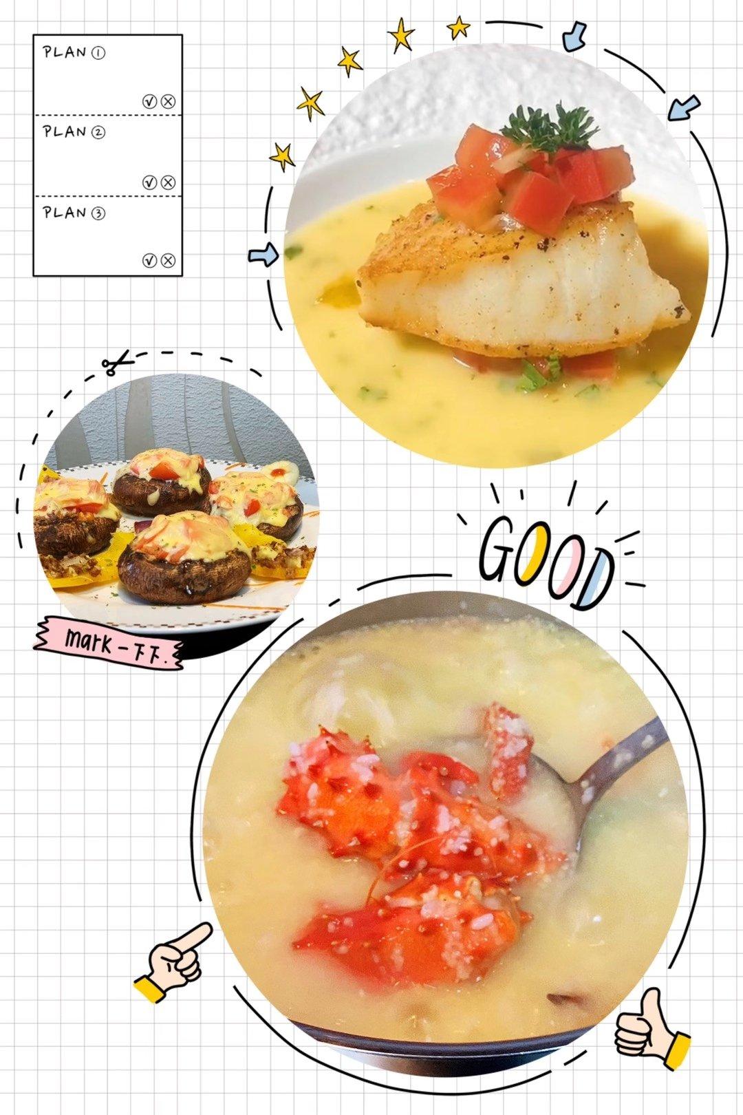 芝士焗蘑菇+柠檬芝士银鳕鱼+帝王蟹海鲜粥