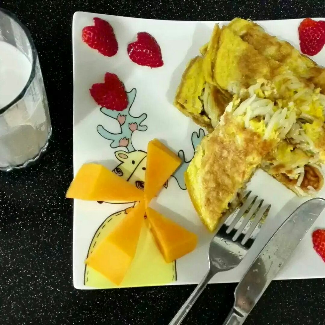 面条煎饼+木瓜草莓+牛奶,面条一样可以高大上😄