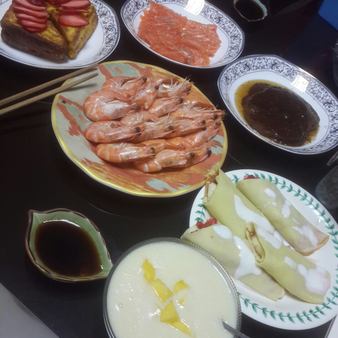 面包,生鱼片,牛排,白灼大虾,椰奶芒果西米露,什么的~