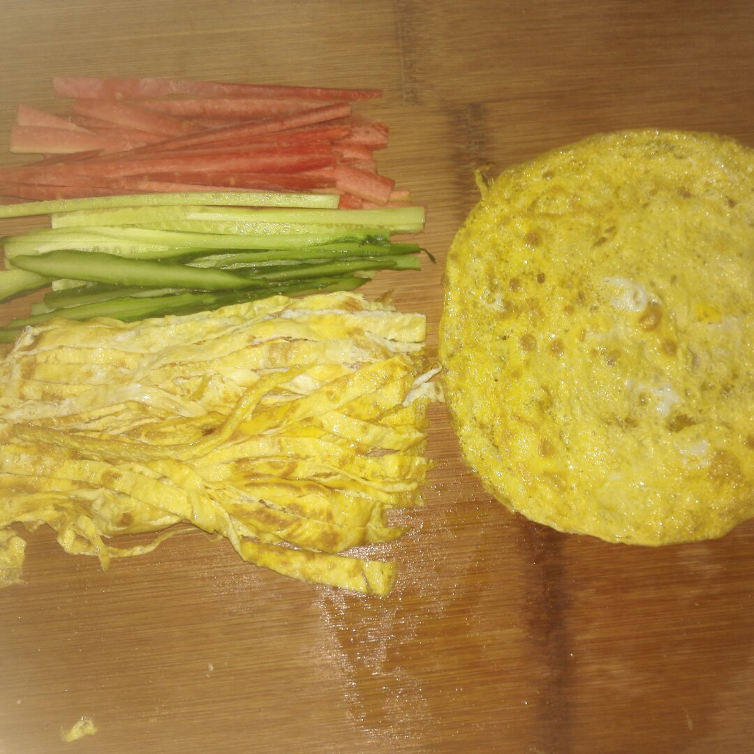 准备好红萝卜、黄瓜、鸡蛋皮、火腿肠,全都切成条。米饭蒸熟,稍晾凉一会儿...