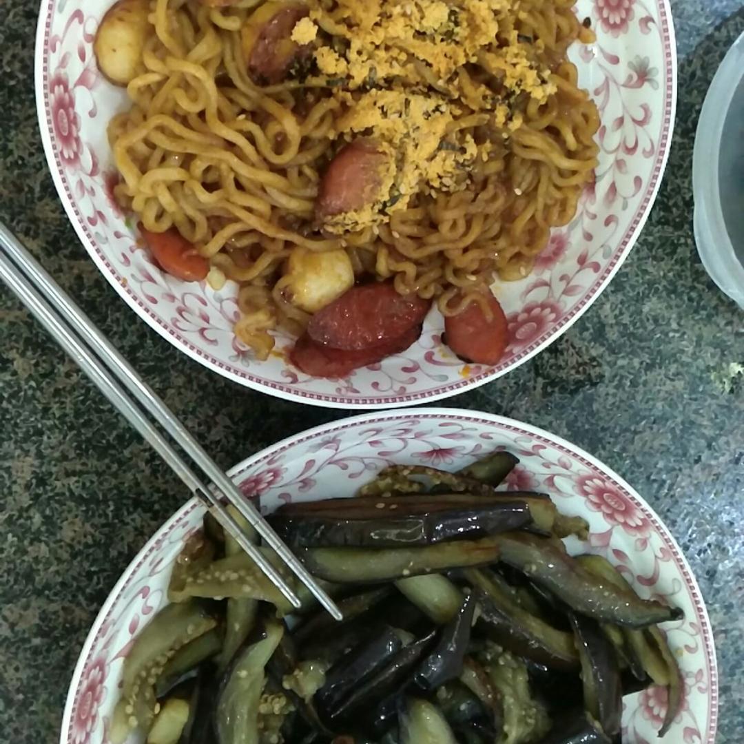 一个人不知道吃啥 炒了个火鸡面 弄了个茄子