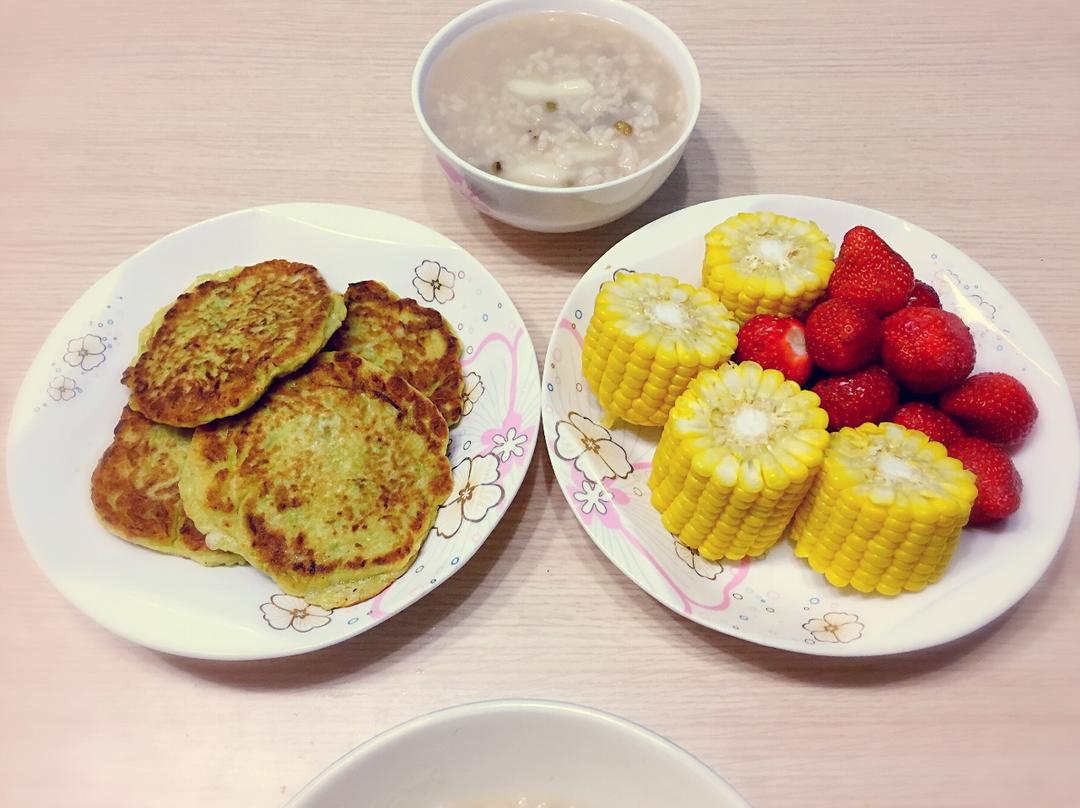 第二天打卡:绿豆山药粥+西葫芦虾皮蛋饼、煮玉米🌽+草莓🍓!!开启一周的好心情