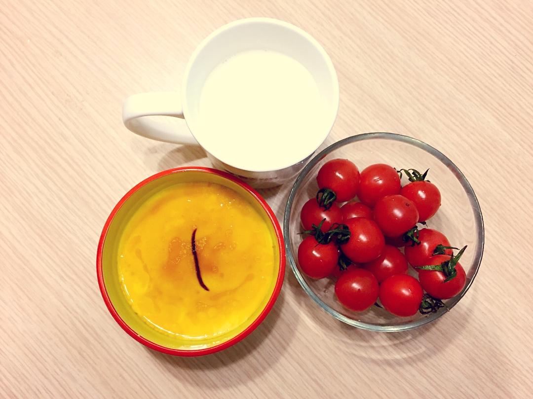 一个人的早餐时间,牛奶+蒸水蛋+圣女果!⬅️最近喜欢上了圣女果!准备开吃才发现忘记拍照,于是就有了这个带勺印版的蛋羹😂 ...