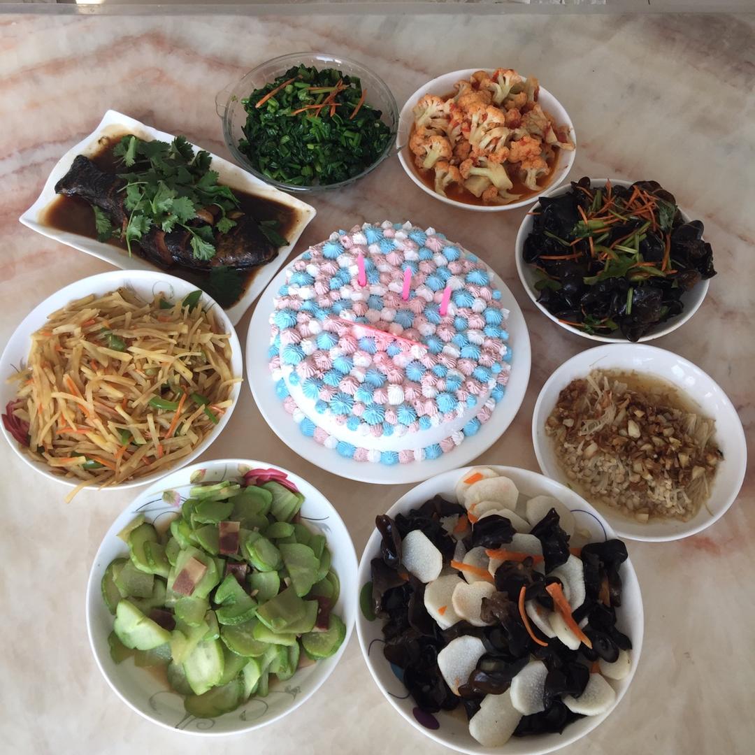 今天宝宝三周岁生日,在家为他和家人准备的一桌素饭饭:红...