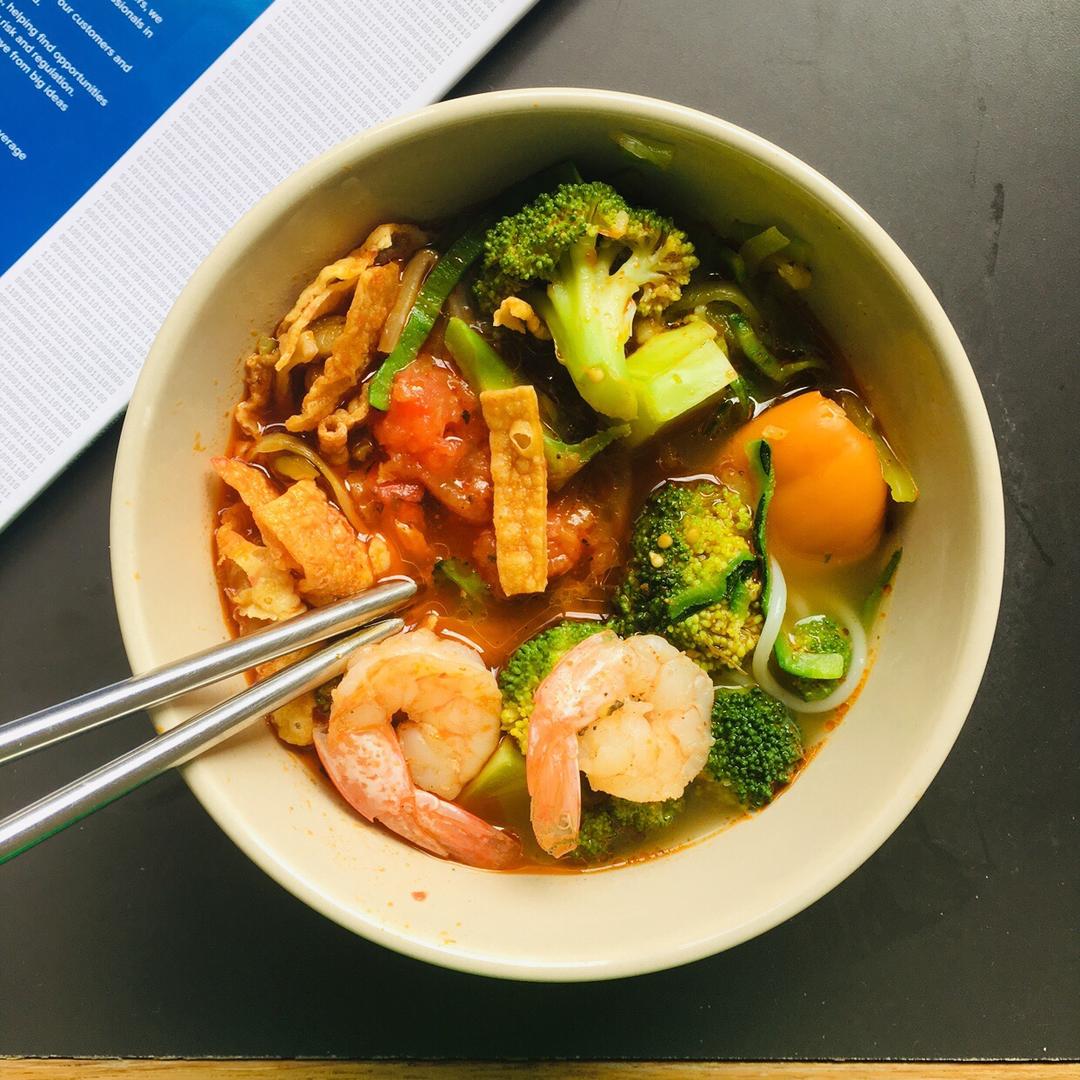 继续低碳水 嘴馋螺蛳粉又担心太咸 所以用了一半的配料 象征性放了几根米饭 主体是zucchini noodl...