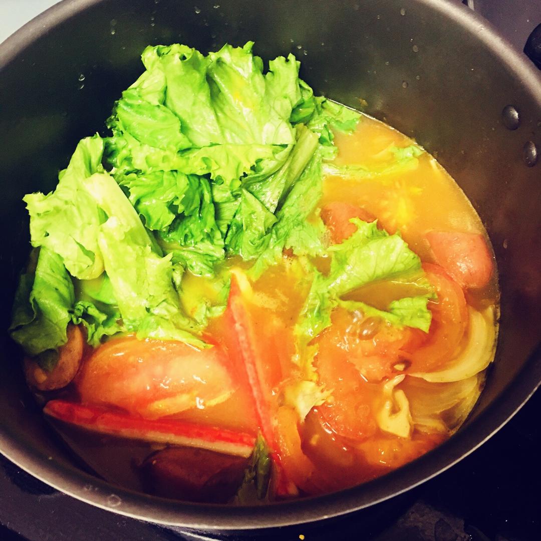 要控碳水惹! 按序在咖喱块融化的开水中放入洋葱 番茄片 Jalapeno&Cheddar sausag...