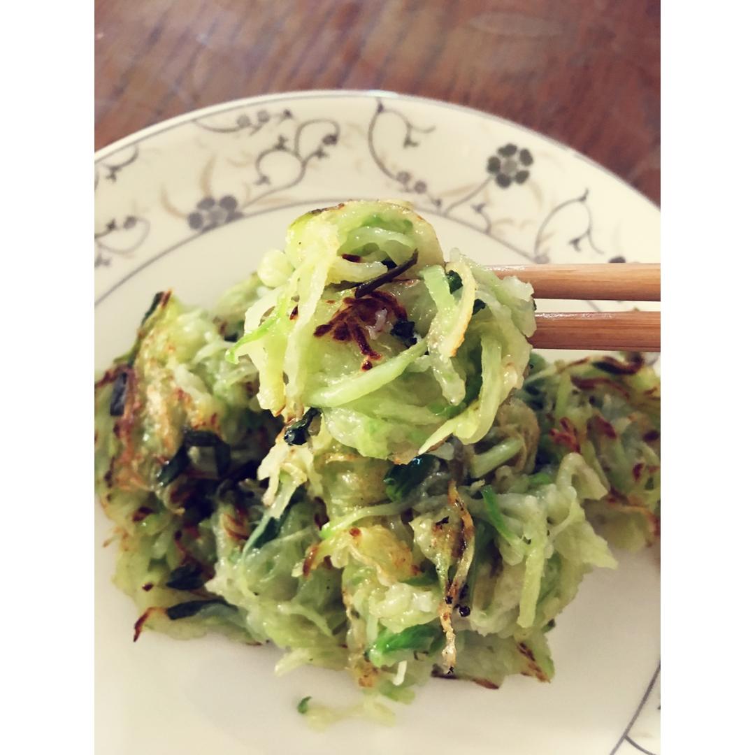 秋风起,青萝卜上市了,擦成丝,拌上葱花香料,和上少许面粉,电饼铛一煎。