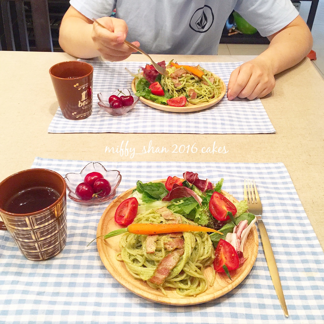 昨天的早餐~嘻嘻~前天晚上做了罗勒酱,所以青酱意面是一定要吃滴!😁