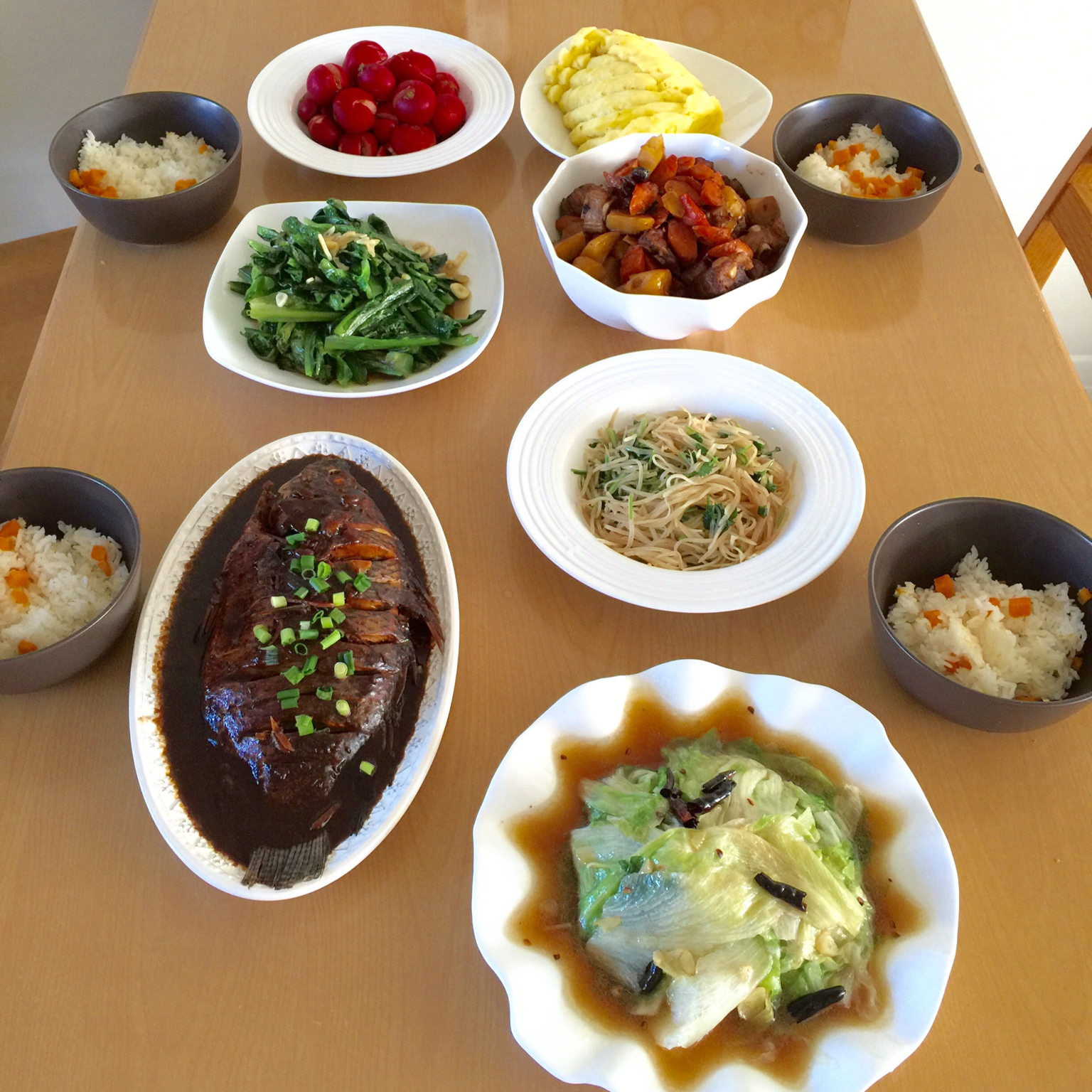 酱汁鱼 蚝油生菜 蒜蓉油麦菜 炒土豆丝 炖排骨 糖醋小萝卜