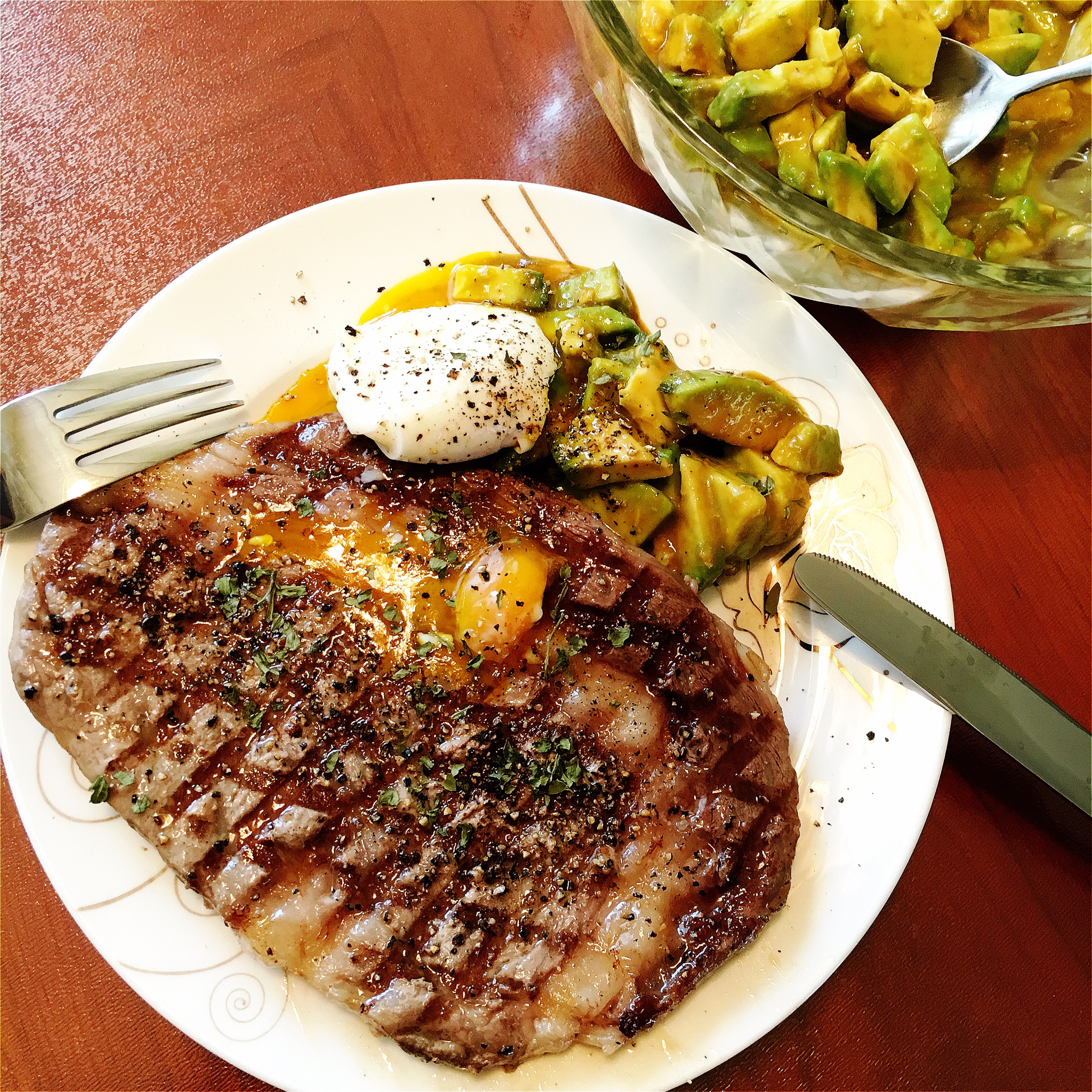 想走个brunch又不想出门,干脆煎块澳洲和牛肉眼,再用酱油芥末油醋汁调个牛油果鸡蛋沙拉~