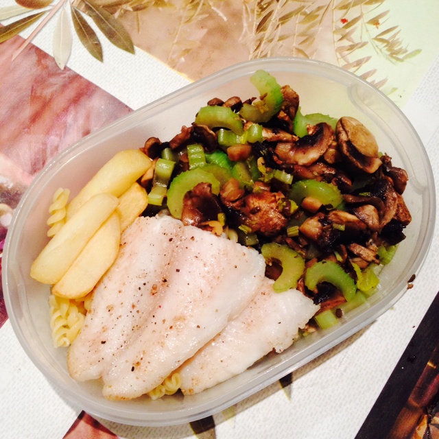 口蘑炒芹菜+螺旋面+少油煎鱼排 还放了几根烤薯条 其实薯条用烤箱烤的油并不多啊,还可以解馋,美哉~ #午餐...