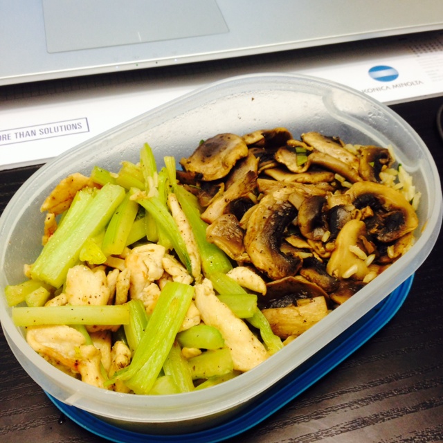 芹菜炒鸡胸+黑椒口蘑+糙米饭 感觉糙米饭好顶饱啊