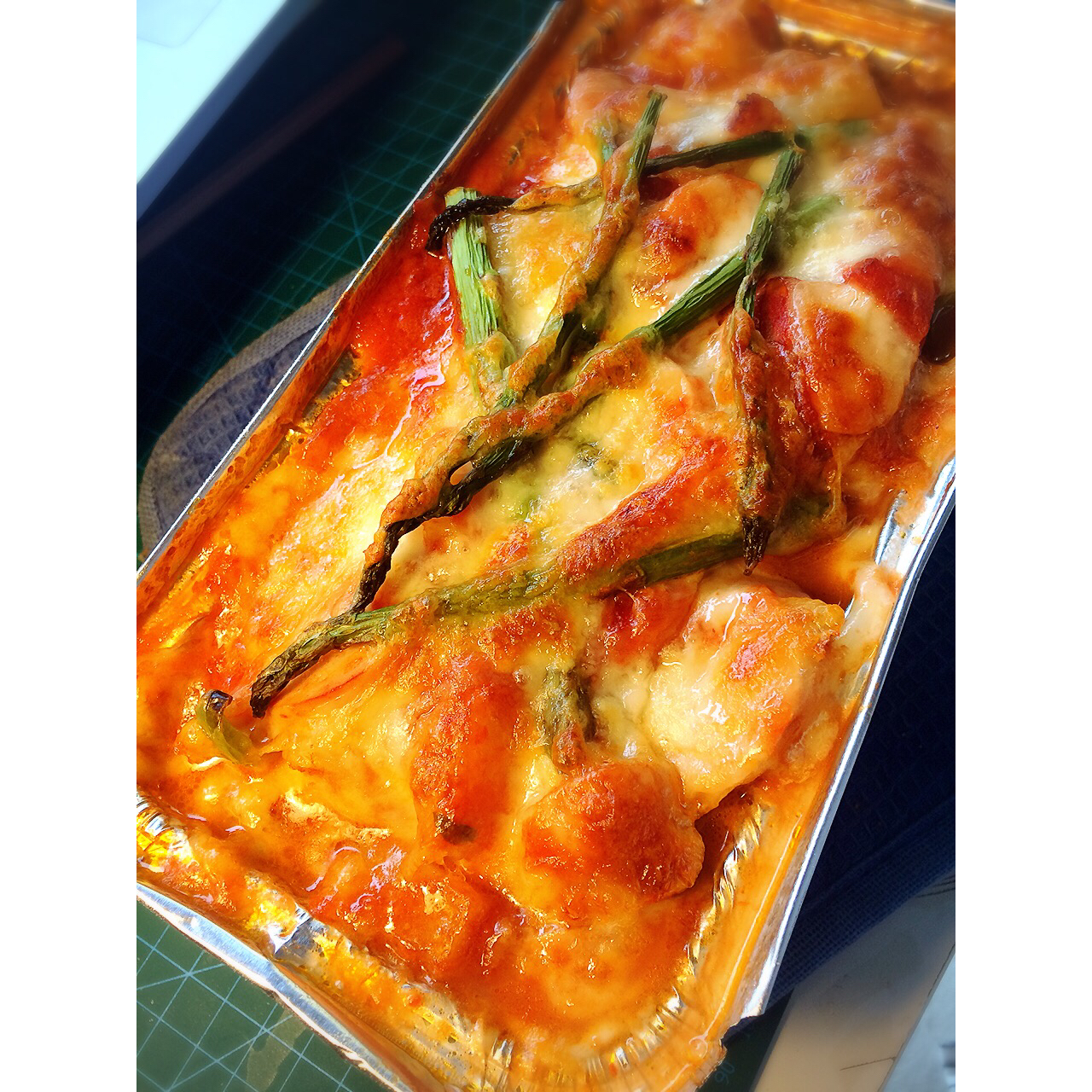 每天过的一模一样好像楚门的世界。高度疲劳的时候就想吃点甜食和肉。芦笋根肉饼,中间包了一块 mozzarella,没有完全...