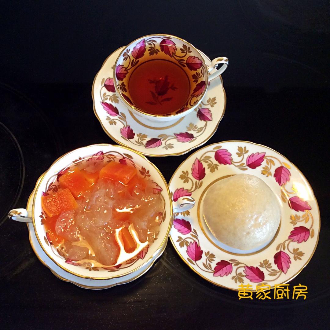 木瓜银耳汤、红糖馒头和红茶(正山小种)。