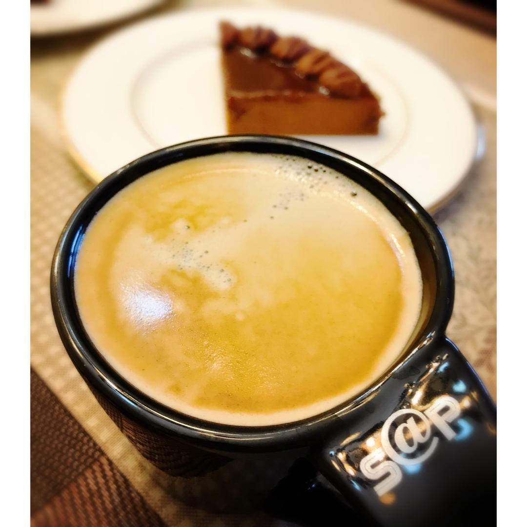 早餐:意式咖啡、美式滑蛋、还有名字超长的慕斯冻芝士蛋糕,就酱。[呲牙]