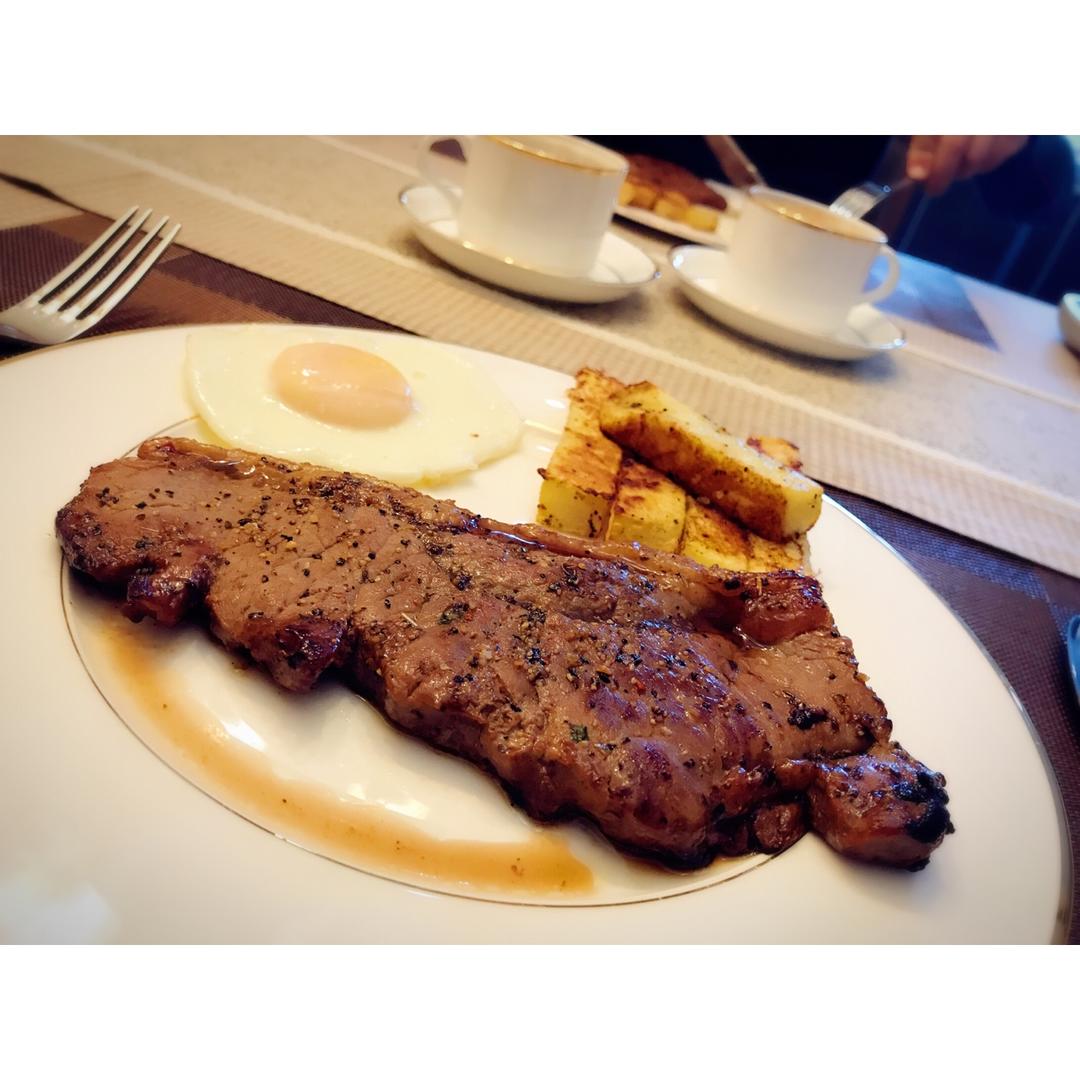 西冷牛排、水煎蛋、烤薯条🍟、咖啡☕。