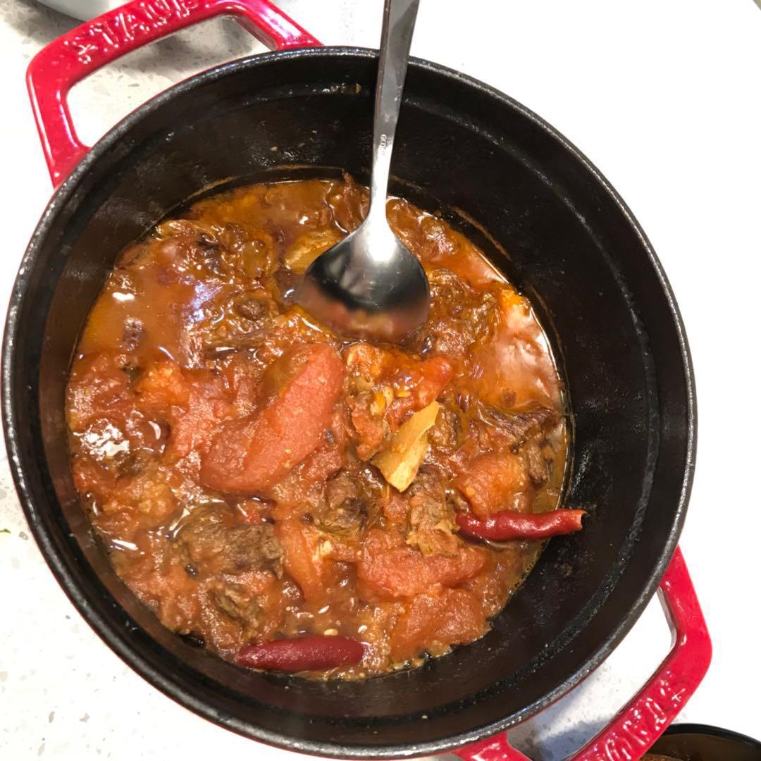 第一次用铸铁锅煮牛肉 心里没啥数 总开锅看,下番茄以后炖了一个半小时~下次再晚点放番茄~