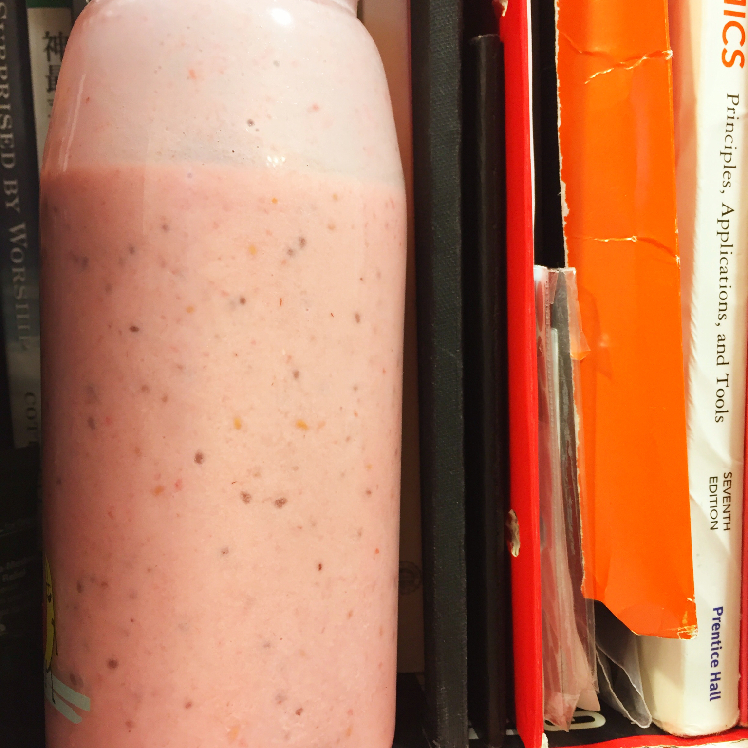 草莓加了牛奶、树莓、蓝莓、chia seed、麦片,好喝的不得了~