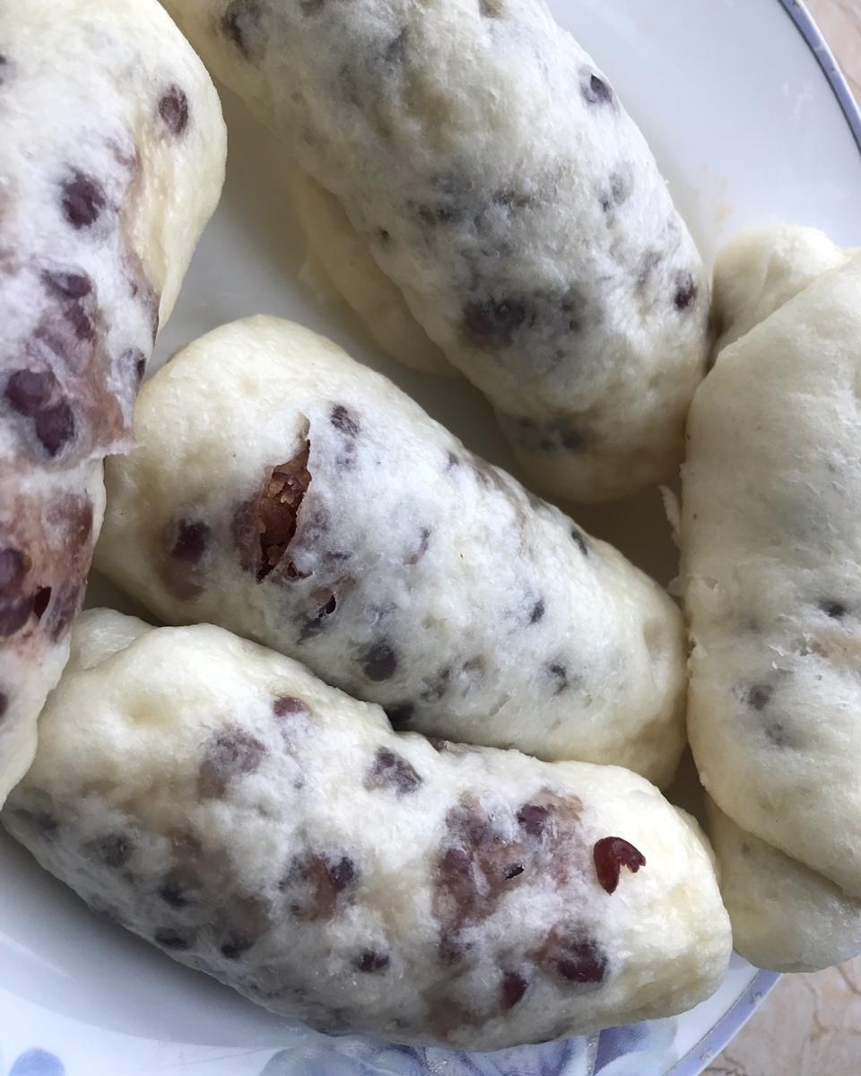 大晚上的,一出锅,忍不住尝了一个,好吃,不喜欢甜的,面里放了点糖,红豆没放糖,软软的,糯糯的,香