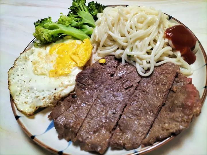 自制牛扒,去市场切一整块牛肉让别人打松肉,回来放耗油,酱油,油腌制一个小时,然后把自己做的手工面条煮熟的时候再加一点冷水...