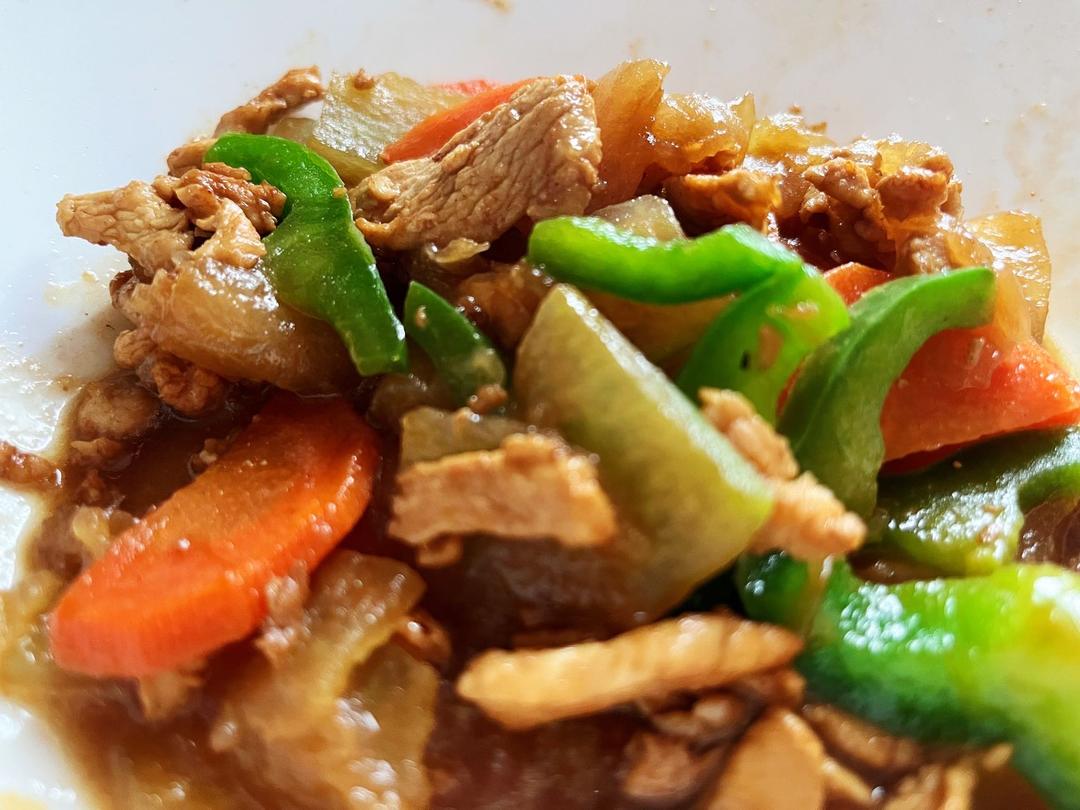 一道冬瓜炒肉 加上青椒胡萝卜做配菜,色香味俱全