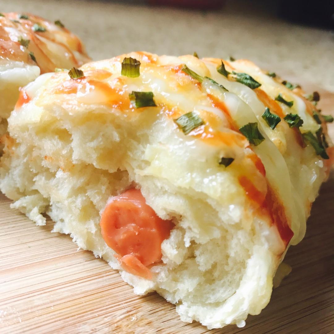 香葱芝士面包 没有面包机 所以 按照别的方子手揉的面 很不错 自己加了香肠馅 培根馅儿